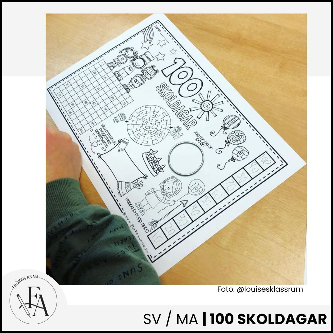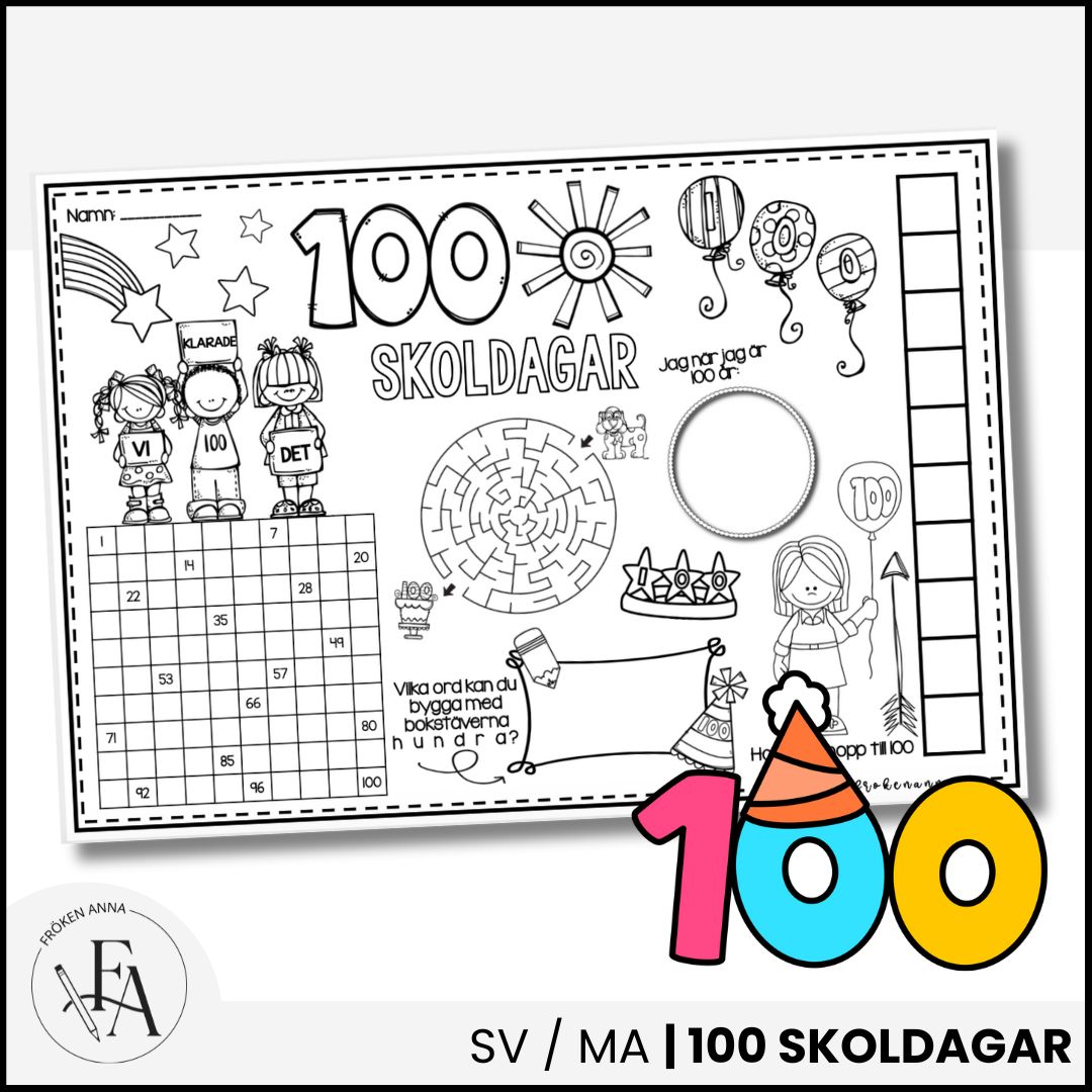 Eleverna får arbeta kreativt med att rita, skriva och färglägga kring temat 100 skoldagar. Pysselbladet passar bra som en lugn aktivitet under firandet och kan med fördel skrivas ut i A3-format för extra arbetsyta.