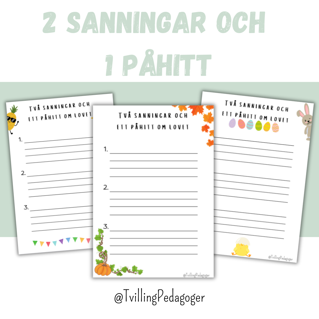 Ett paket med 2 sanningar och 1 påhitt med olika teman Sommarlov Höstlov Jullov Sportlov Påsklov Om mig Saker jag tycker om