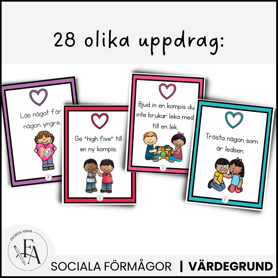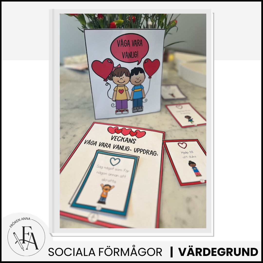 28 våga vara vänlig – uppdrag med fokus att vara en bra kompis och träna på sociala förmågor. Välj själv om ni vill ha dagens / veckans eller månadens uppdrag. Materialet kan användas i samband med vänliga veckan eller när ni vill ha en fokusvecka / månad och exemplifiera vänliga handlingar och träna på dessa.