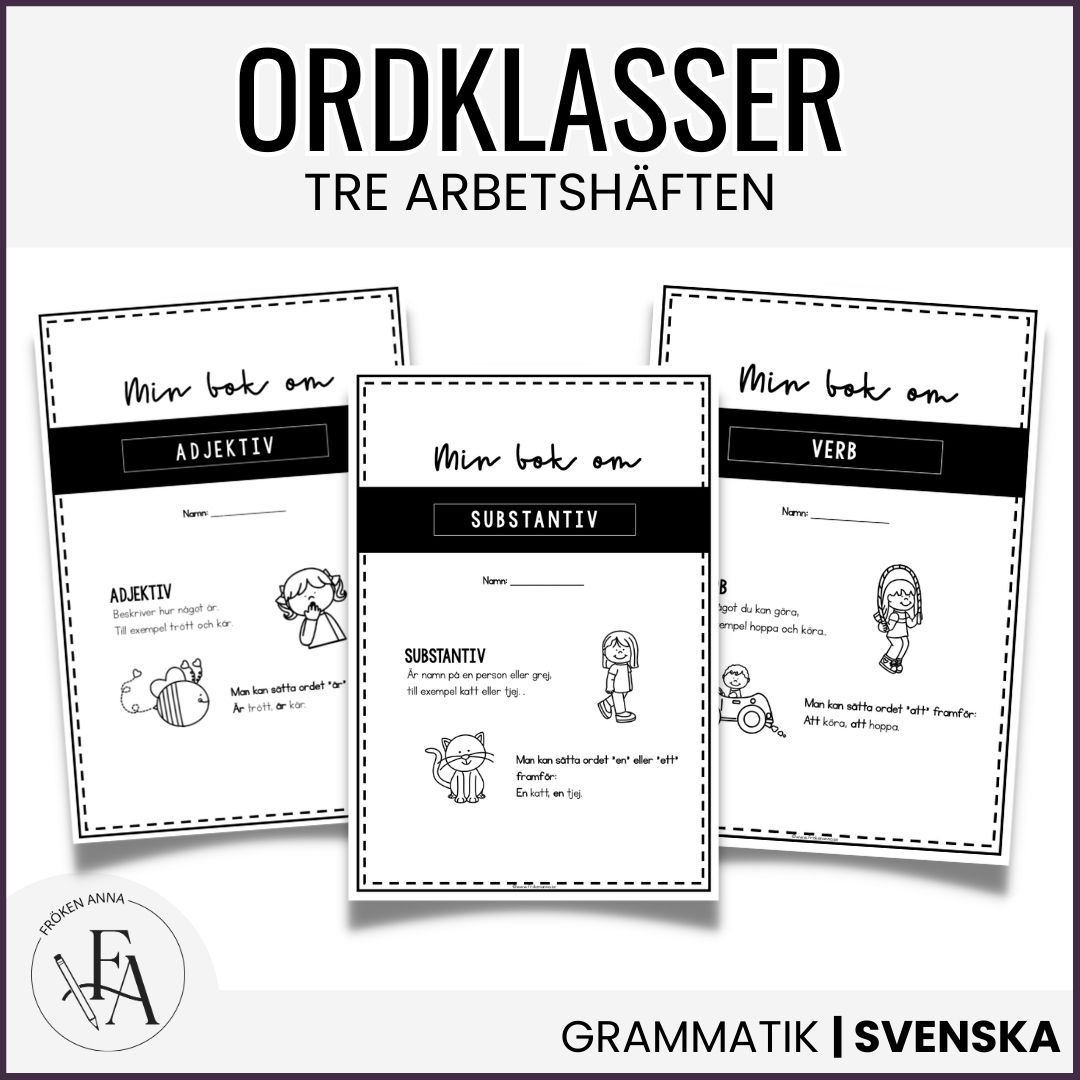 Detta paket innehåller tre pedagogiska arbetshäften som ger eleverna en tydlig och strukturerad genomgång av ordklasserna substantiv, adjektiv och verb. Materialet är framtaget för undervisning i svenska i åk 1–3, men fungerar även bra för äldre elever i behov av repetition eller extra stöd.