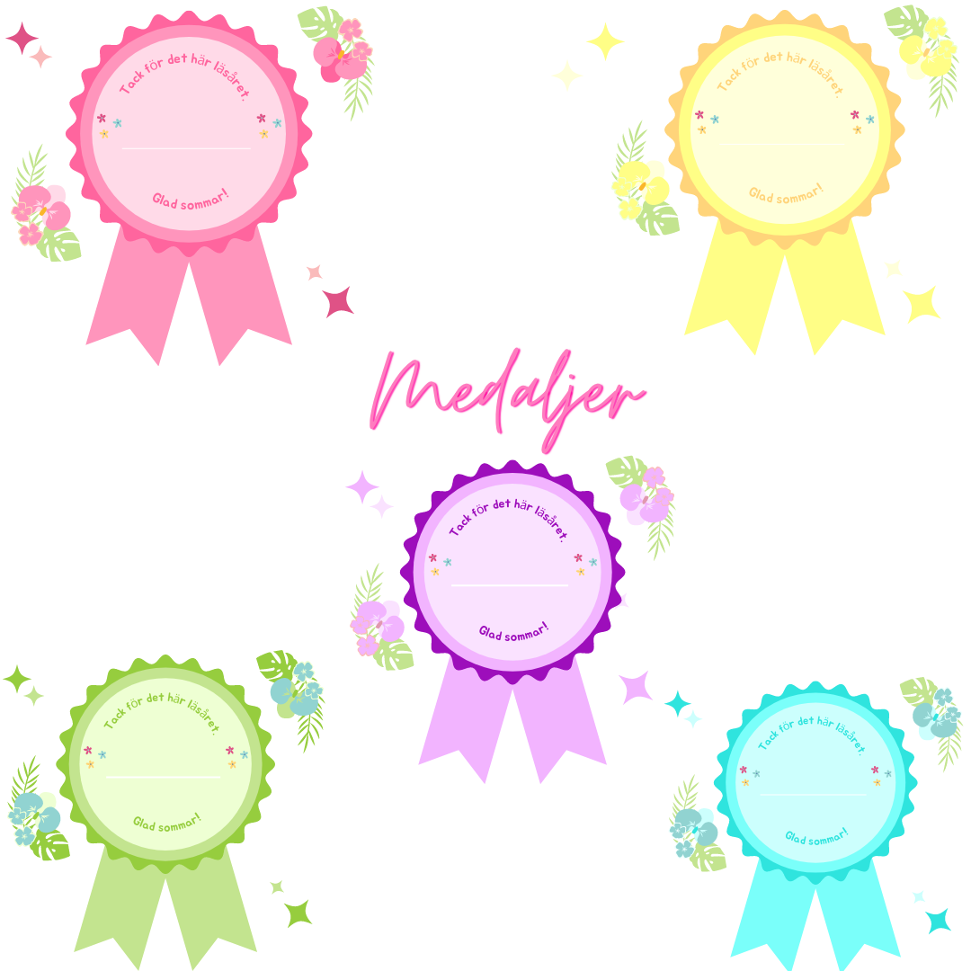 Medalj till skolavslutningen där du kan välja mellan fem olika färger: rosa, grön, blå, gul och lila. ?