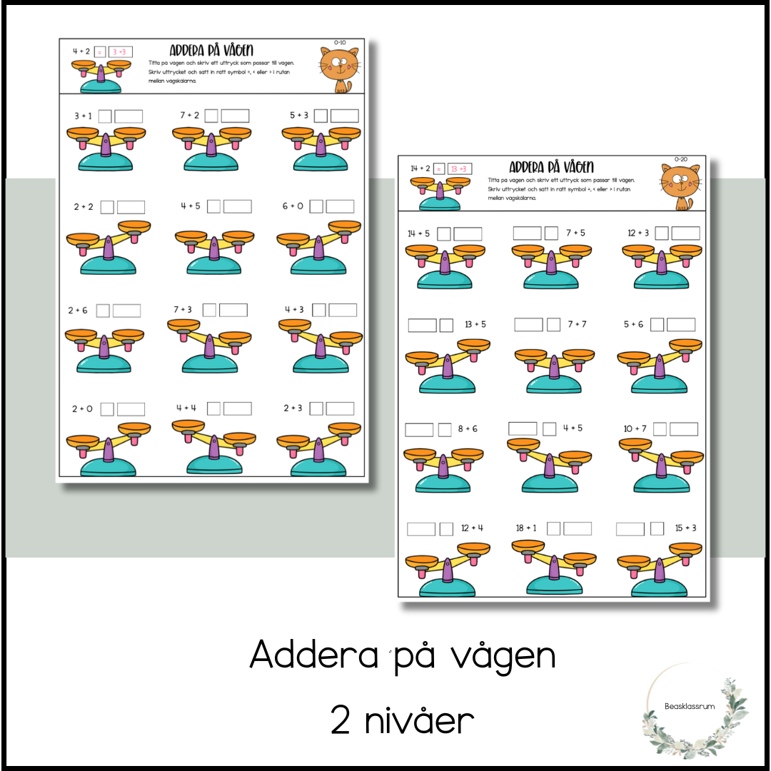Addera på vågen. Eleven ska skriva ett uttryck som passar till vågen samt symbolen mellan uttrycken. Materialet finns i två nivåer, 0-10 och 0-20. 2 arbetsblad till varje nivå.