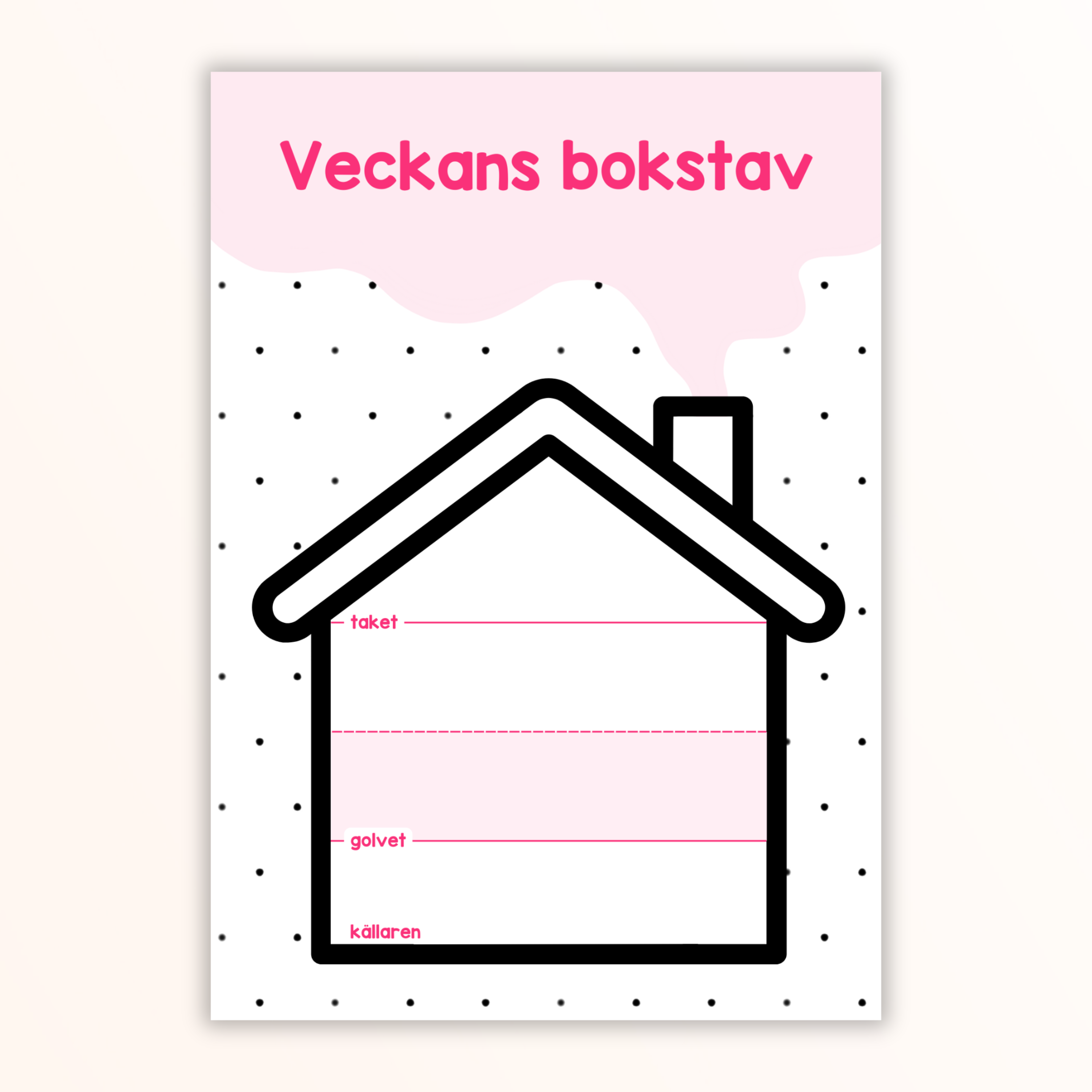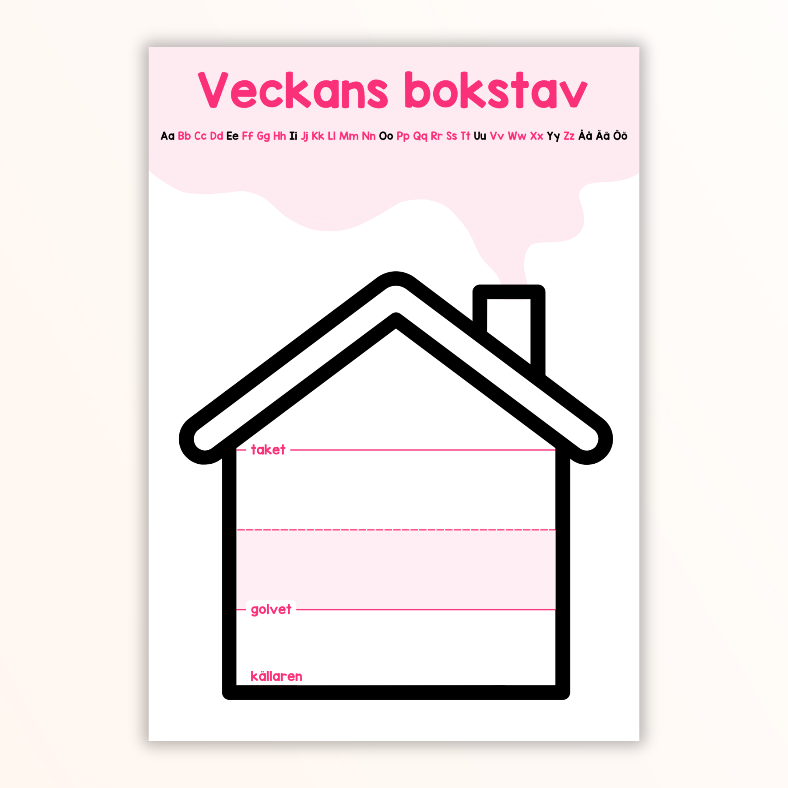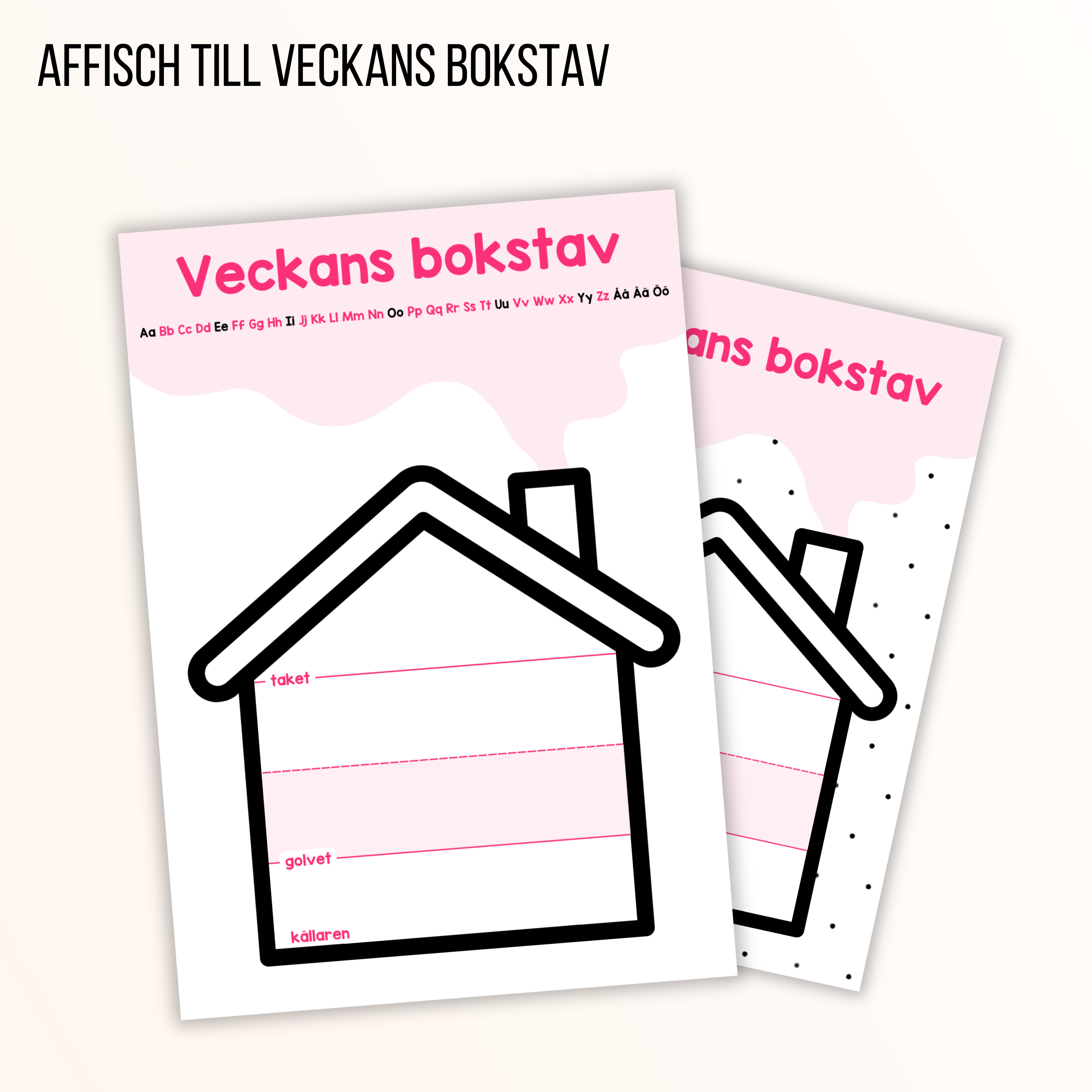 Affisch till veckans bokstav. Skriv ut (gärna i A3-format), laminera och använd whiteboardpenna för att skriva veckans bokstav. På ena varianten av affischen finns även ett alfabet där du kan ringa in var i alfabetet bokstaven är placerad.