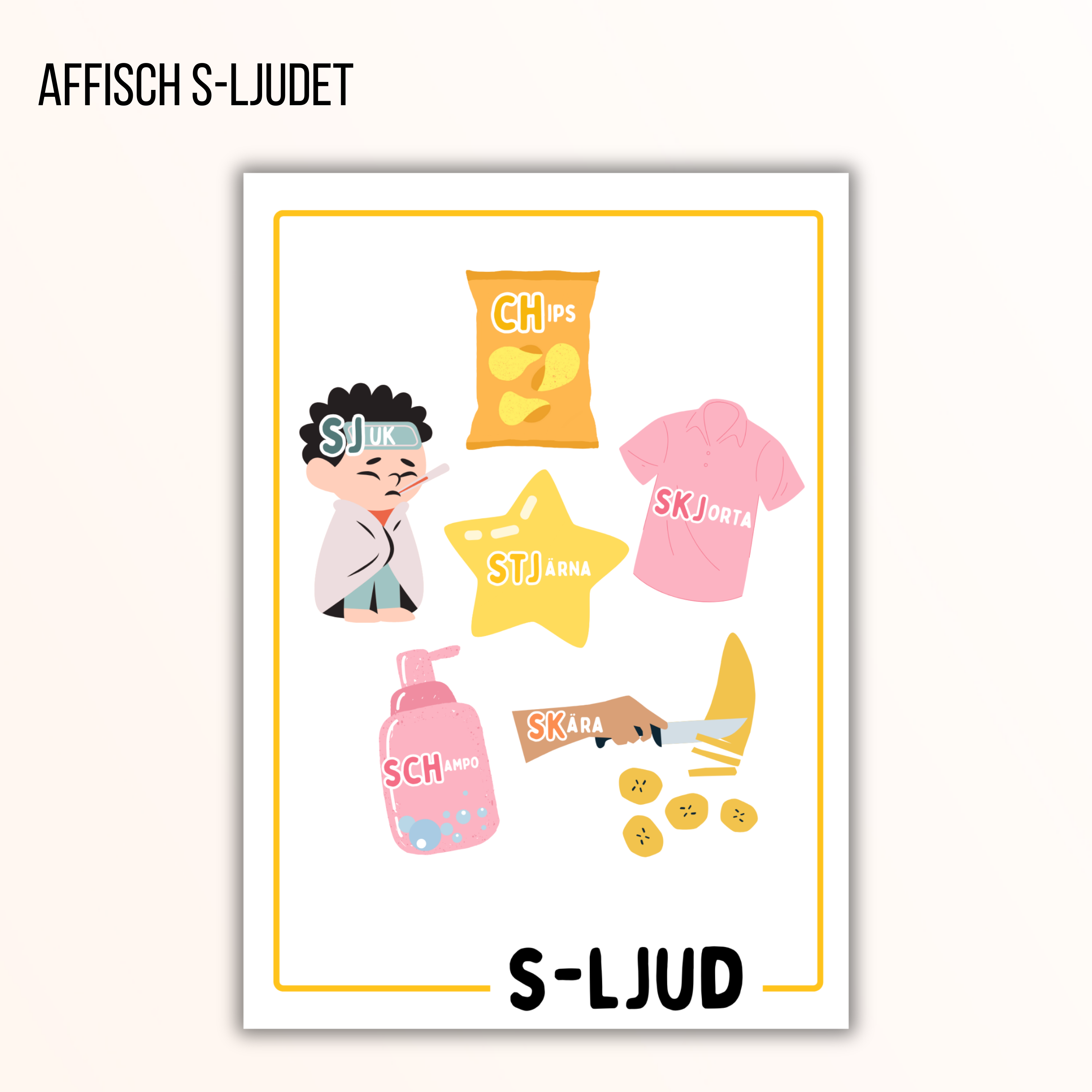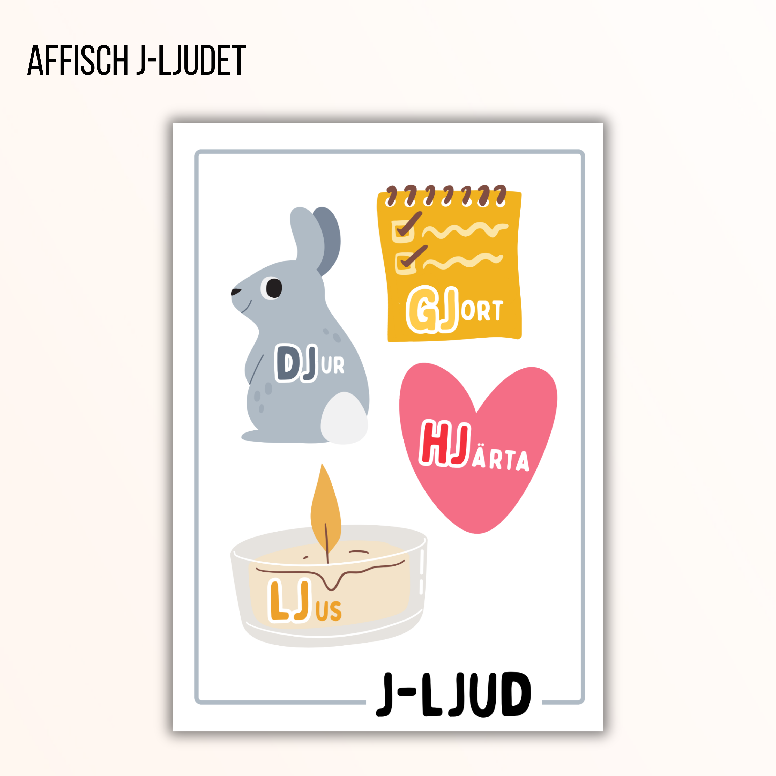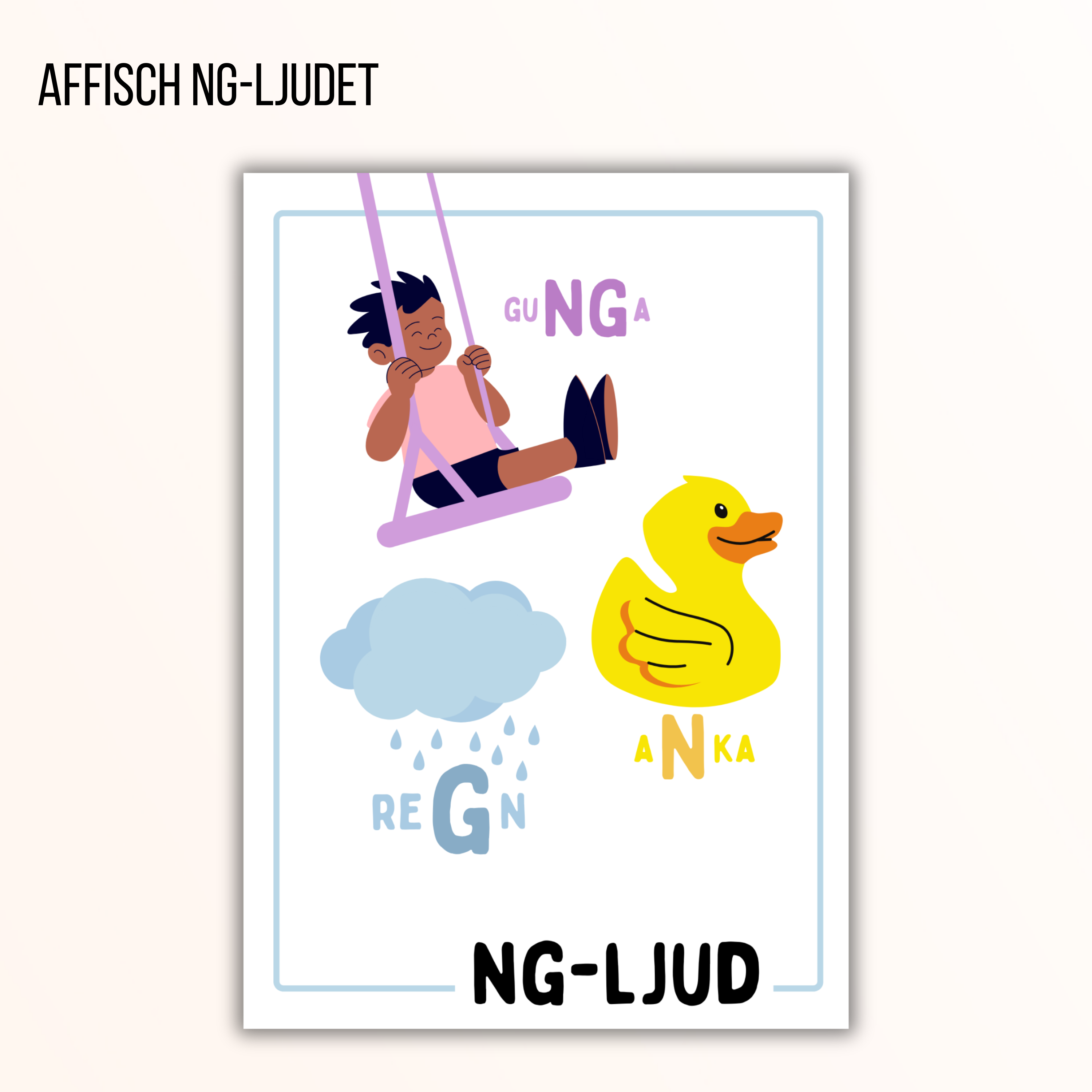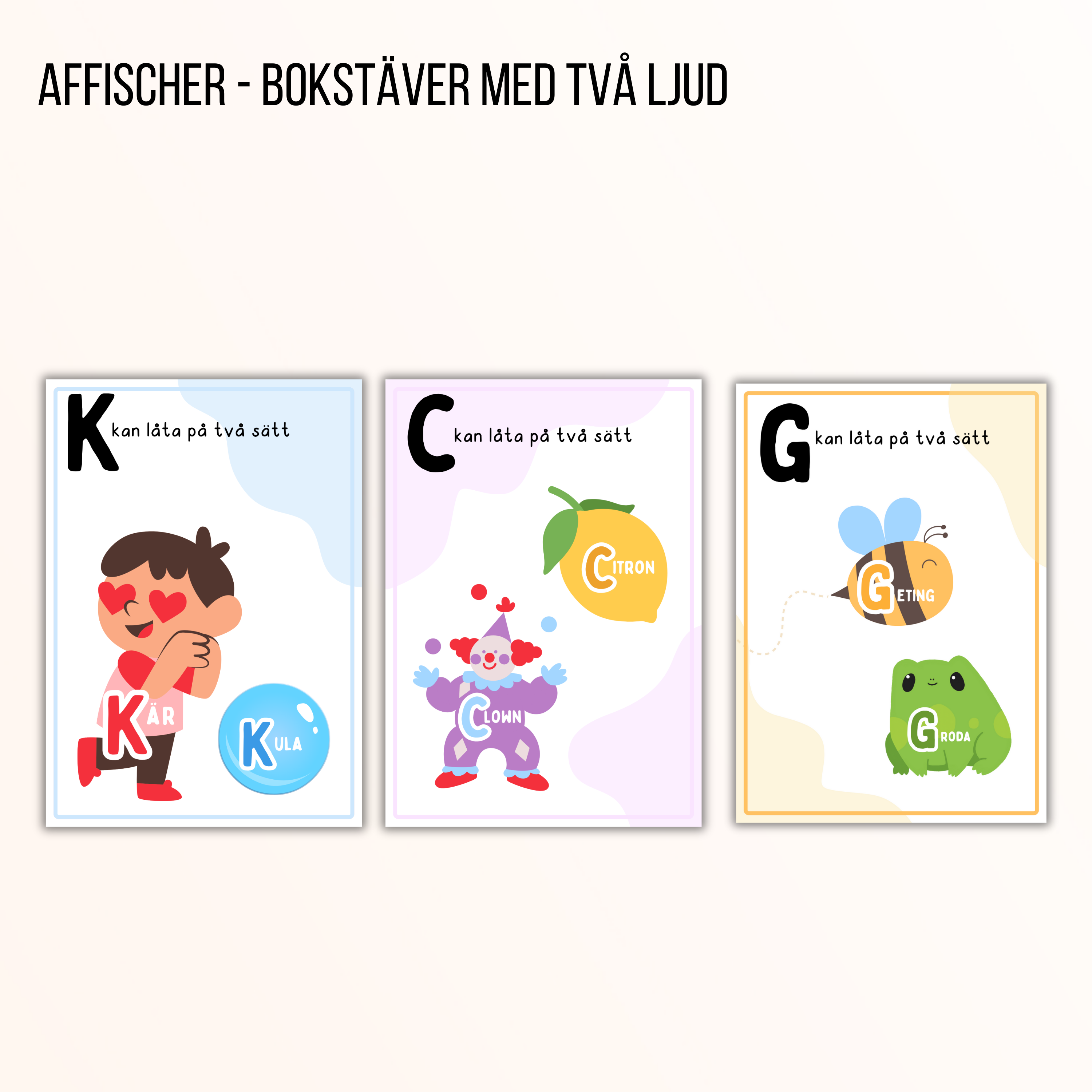 Affischer med bildstöd som tydliggör hur vissa bokstäver kan låta på flera sätt, samt olika stavningar för s-ljud, ng-ljud och j-ljud.