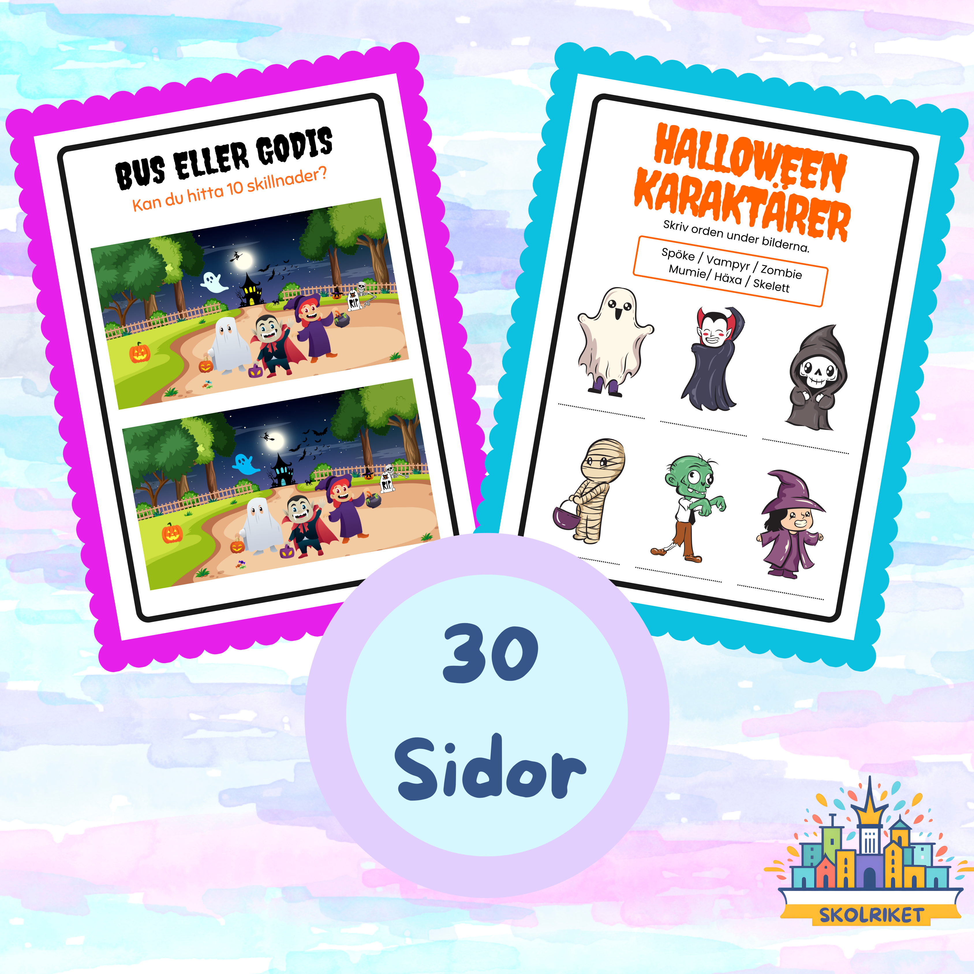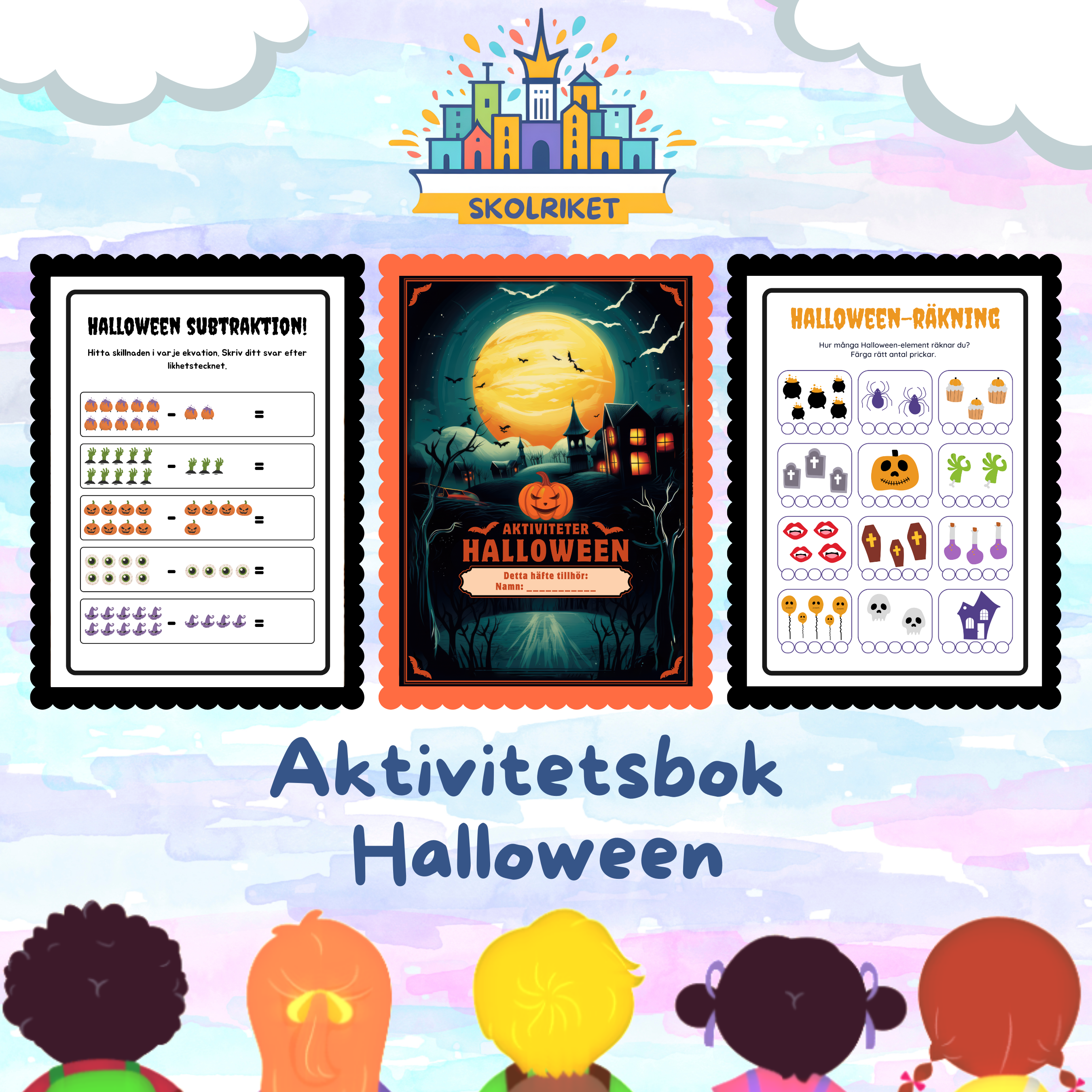 Stor aktivitets bok med temat Halloween. 30 sidor med aktivitets blad som innehåller bland annat, addition och subtraktion, måla, räkna, skriva, pyssel och lärorika övningar.