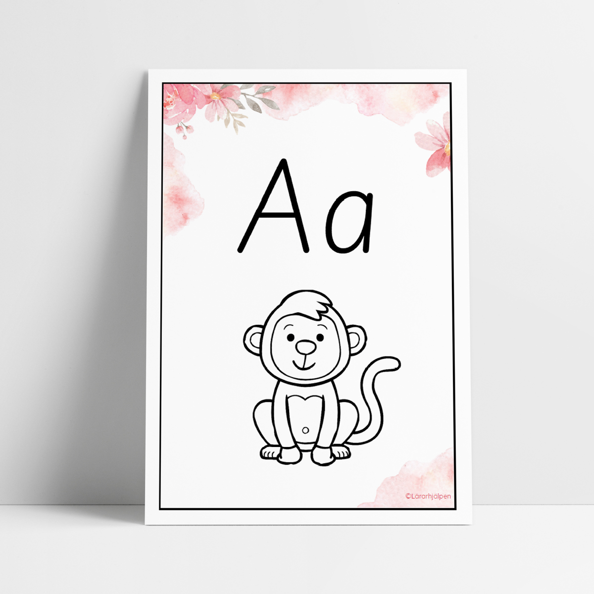 Varje bokstav presenteras på en A4-sida tillsammans med en svartvit bild med samma begynnelsebokstav. Alfabetet finns i två varianter, en med svarta bokstäver och en med markerade vokaler. Varje vokal har dessutom två sidor - en för varje ljud.A - apaA - ananasB - bokC - citronD - delfinE - enhörningE - elefantF - fiskG - grodaH - halsbandI - iglooI - idéJ - jordgubbeK - kritaL - lövM - musN - näsaO - ostO - oroligP - pennaQ - quinoaR - rosettS - solT - trädU - ubåtU - ugglaV - valW - walkie talkieX - xylofonX - xylofonY - yxaY - ytaZ - zebraÅ - ålÅ - åskaÄ - äppleÄ - ädelstenarÖ - öppenÖ - ö