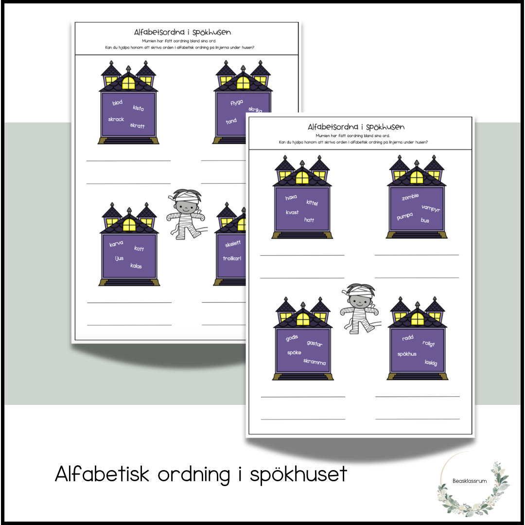 Träna alfabetisk ordning med mumien. Orden i spökhuset har hamnat huller om buller.