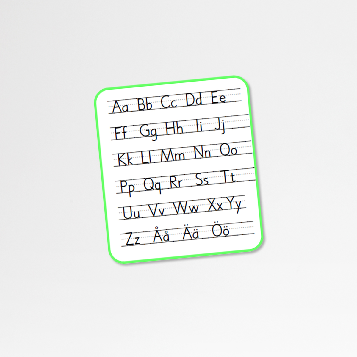 Ett litet kort med alfabetet som du kan skriva ut och laminera för att kunna återanvända. Eleverna kan använda korten som stöd för att se var bokstäverna skrivs på och i förhållande till raden.