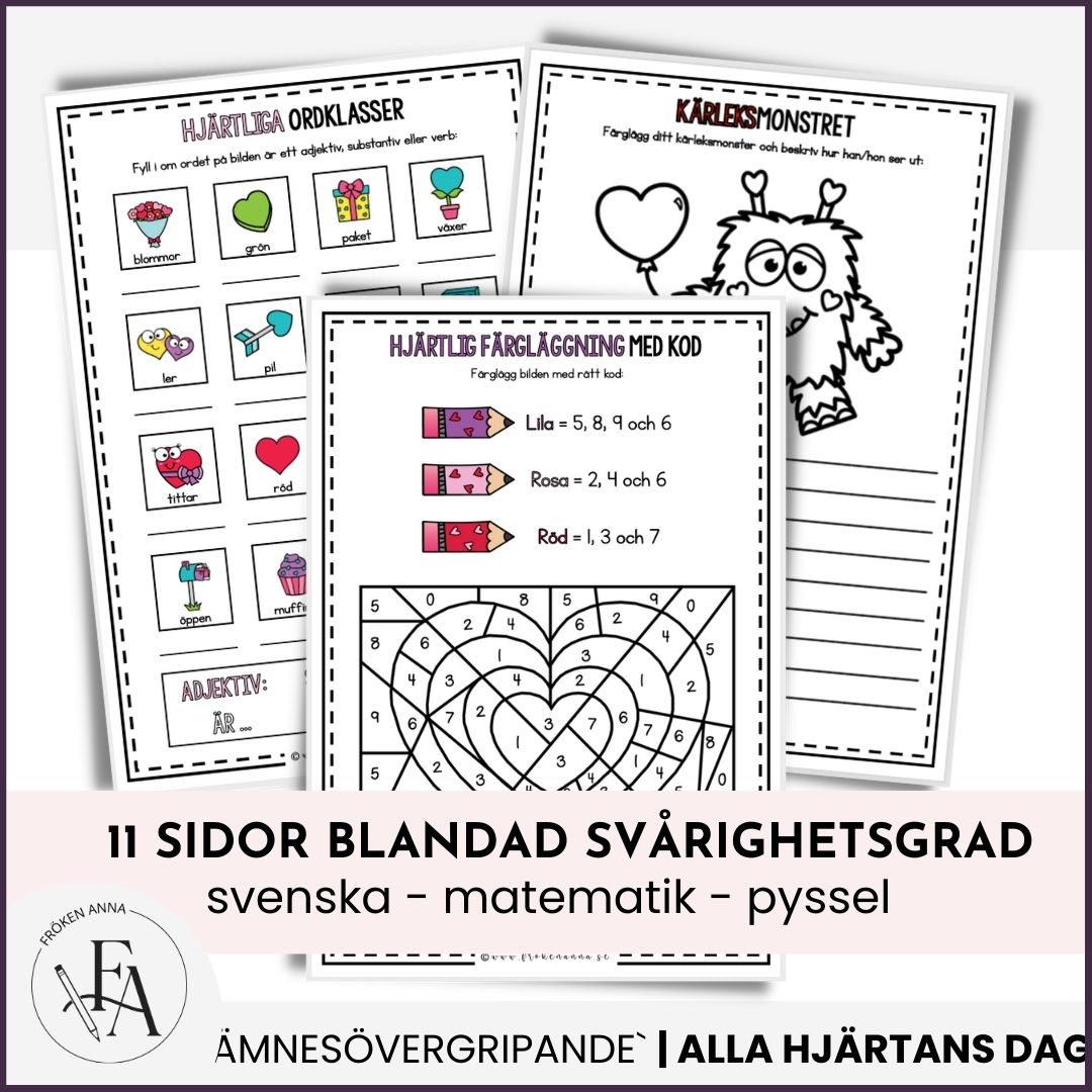 Arbetshäfte på 11 sidor (+ framsida)  med blandade uppgifter i svenska och matematik som passar att göra i samband med alla hjärtans dag. Välj de sidor som passar just din elev- eller barngrupp, eller låt eleverna själva sätta ihop sitt eget häfte med valfria sidor.