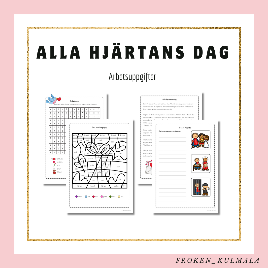 Uppmärksamma Alla hjärtans dag med detta material. Här får eleverna lära sig mer om vad Alla hjärtans dag är och varför vi firar den. De får även varierade arbetsuppgifter som är kopplad med temat vänskap och kärlek. Du kan själv välja att arbeta med materialet som enskilda arbetsblad eller som arbetshäften.
