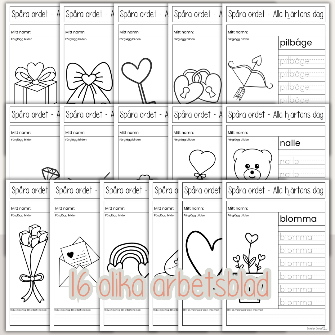 16 olika arbetsblad med uppgift att spåra ord med kärlekstema inför Alla hjärtans dag och vänliga veckan