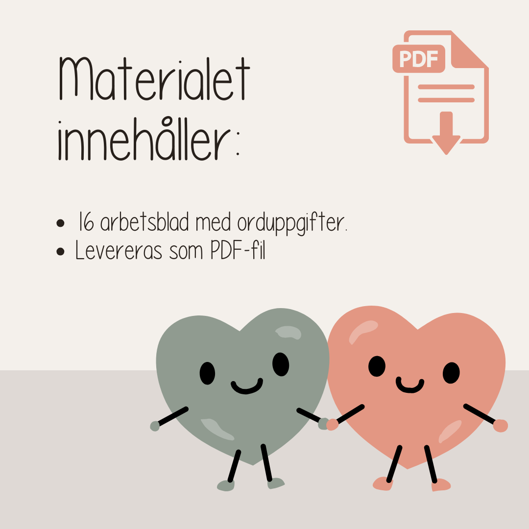 16 olika arbetsblad med uppgift att spåra ord med kärlekstema inför Alla hjärtans dag och vänliga veckan Spåra ordet Färglägg bilden Skriv en mening Levereras som en PDF-fil