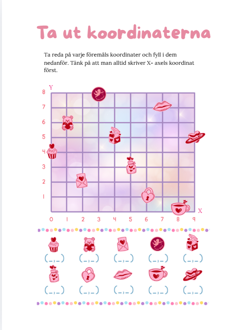 Här får eleverna ta ut koordinater, göra ett stapeldiagram, spela tre i rad, knäcka en kod på engelska. Dessutom två olika Mandalas samt kuvert att dekorera själva eller ett med färdiga bilder på att färglägga.