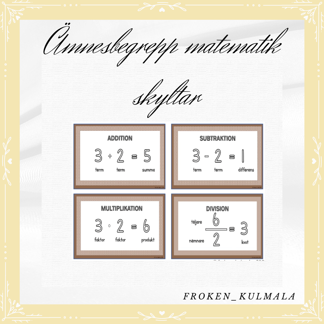 Träna på matematiska språket i de fyra räknesätten med dessa neutralfärgade skyltar.