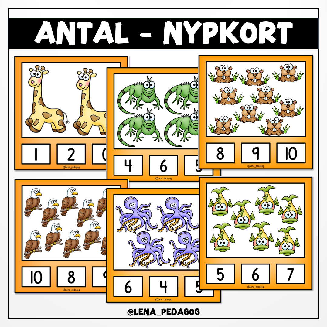 72 nypkort med 1-10 djur på. Används med klädnypor eller laminerat med whiteboardpennor.