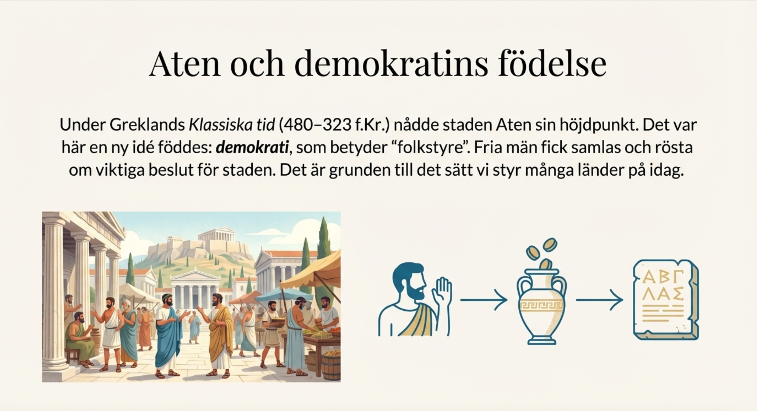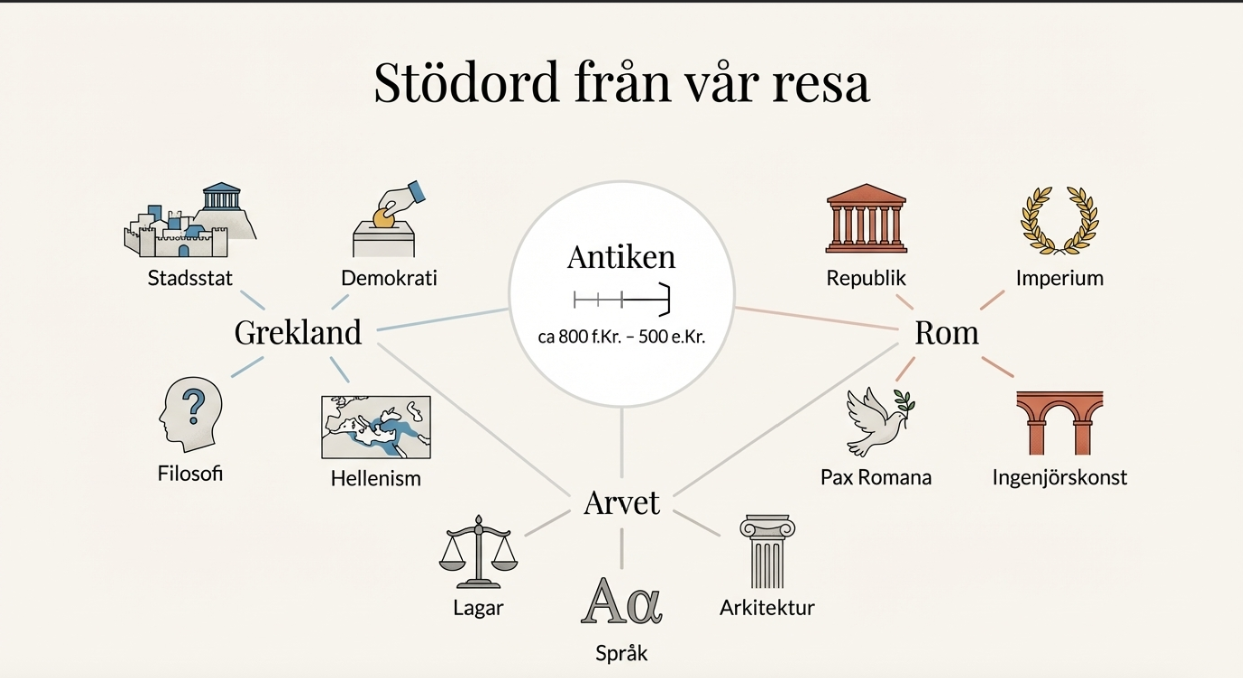 Denna PowerPoint-presentation i 16 sidor behandlar Antiken och är utformad för att ge elever en strukturerad och lättillgänglig förståelse av perioden ca 800 f.Kr. – 500 e.Kr. Fokus ligger på de två centrala civilisationerna Grekland och Rom, deras samhällsformer, idéer och det historiska arv de lämnat efter sig.