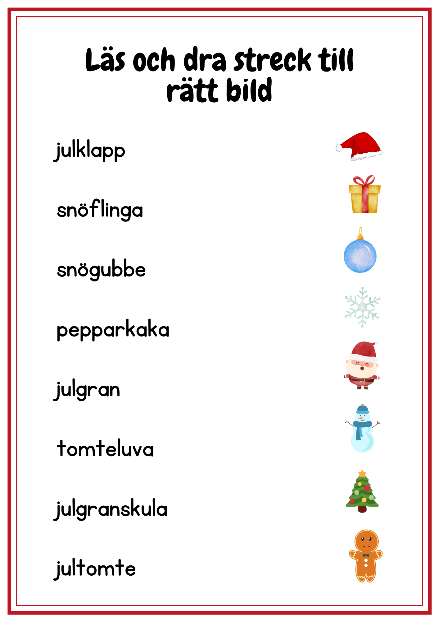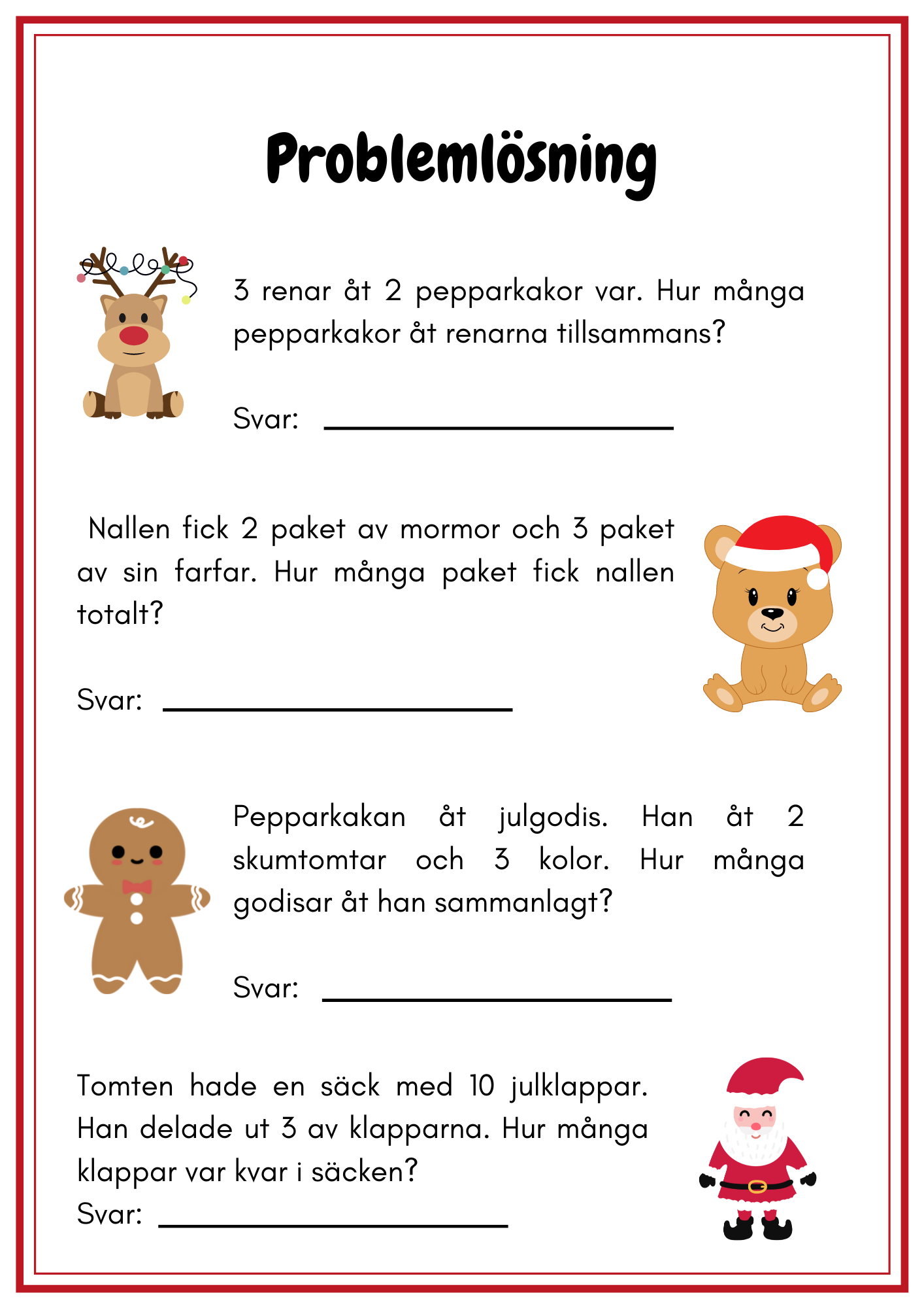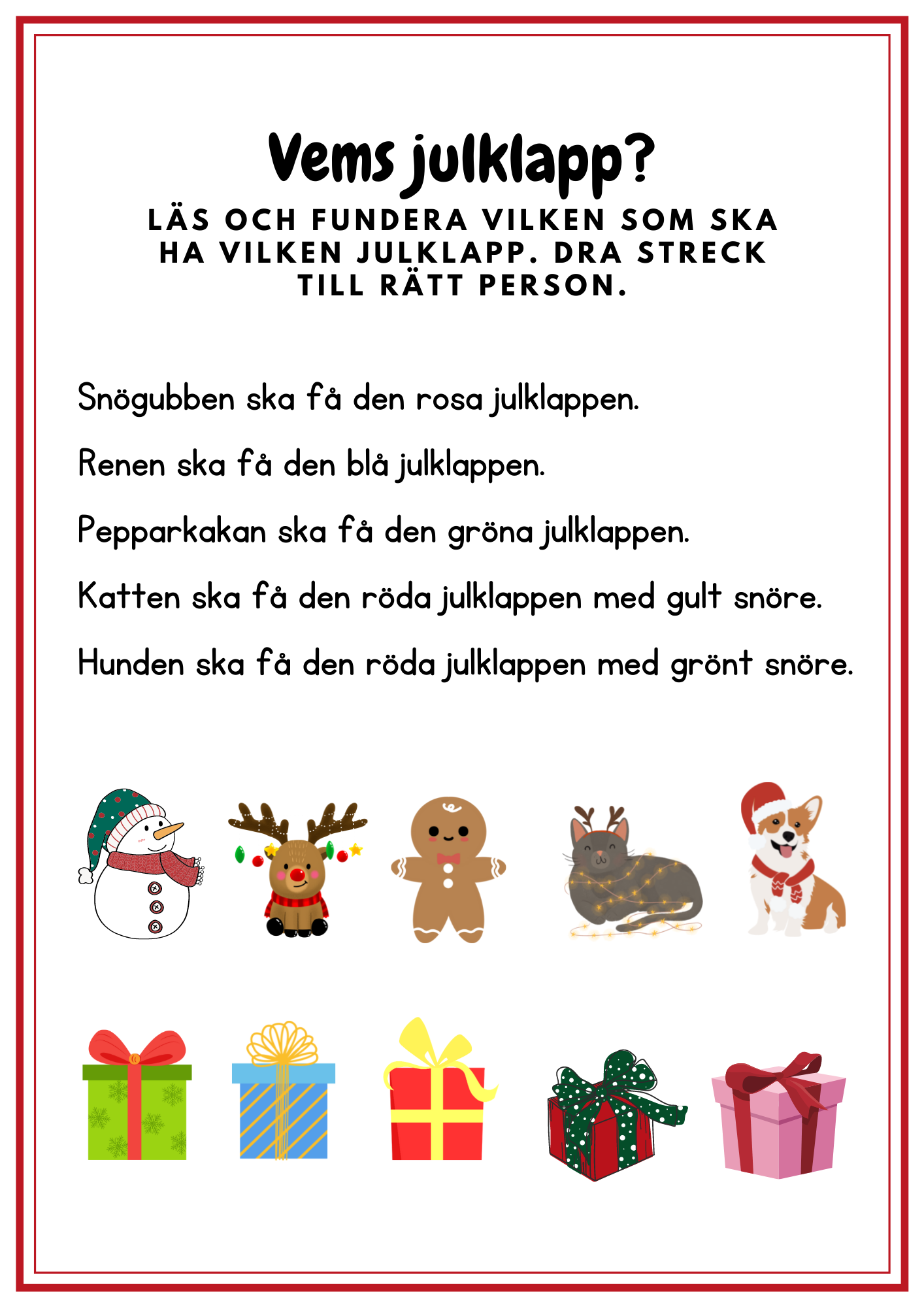 Ett julinspirerat häfte med blandade uppgifter i svenska och matematik. Totalt 12 sidor arbete plus framsida och baksida. Innehåller: läs och dra streck till rätt ord, spåra och skriv ordet, träna 10-kompisar, spåra, talens grannar, udda/jämna, läsförståelse, skriva meningar, läs och färglägg och problemlösning.