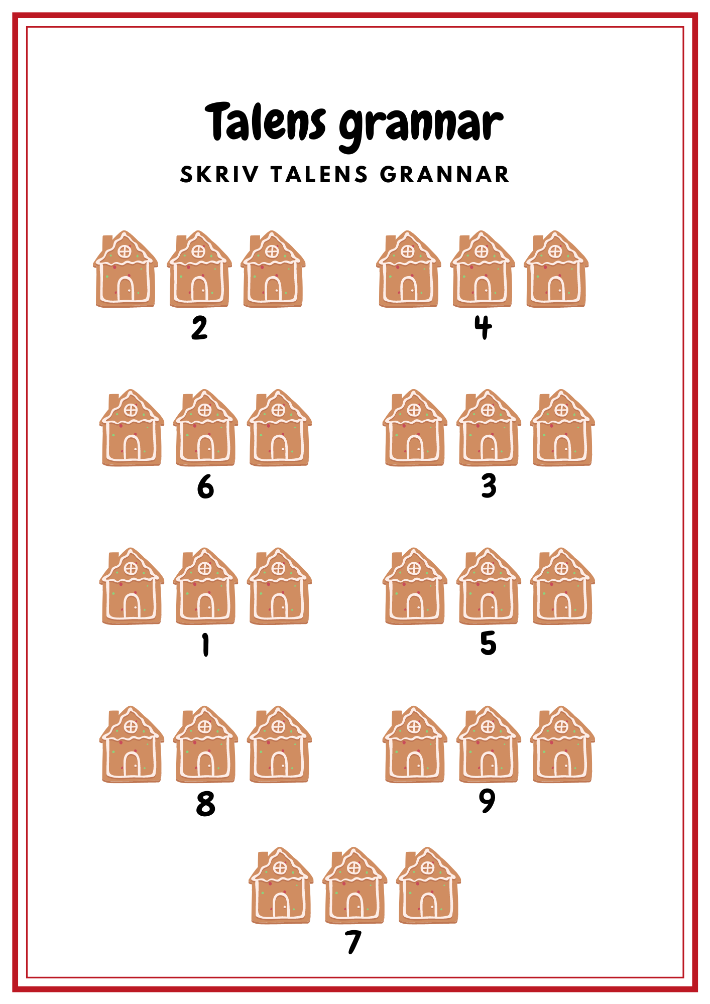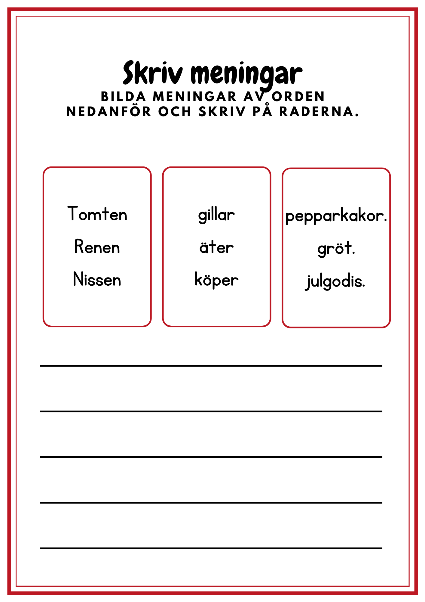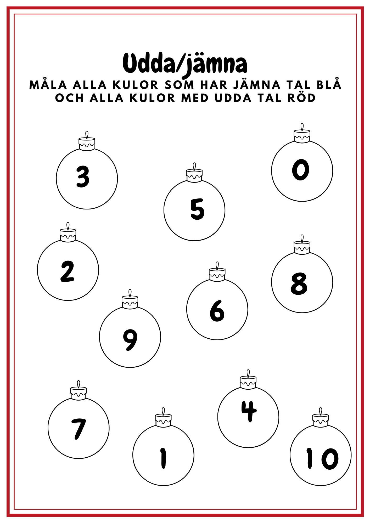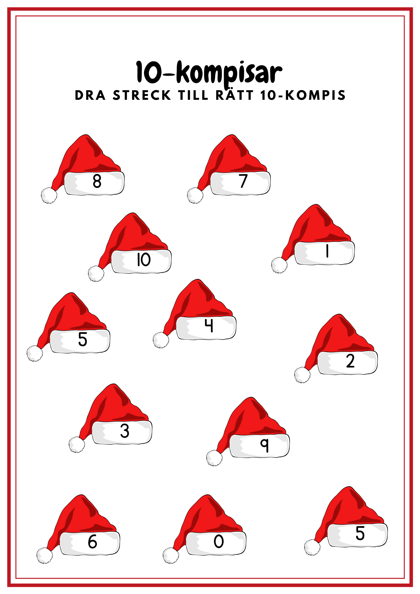 Ett julinspirerat häfte med blandade uppgifter i svenska och matematik. Totalt 12 sidor arbete plus framsida och baksida. Innehåller: läs och dra streck till rätt ord, spåra och skriv ordet, träna 10-kompisar, spåra, talens grannar, udda/jämna, läsförståelse, skriva meningar, läs och färglägg och problemlösning.