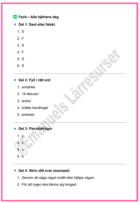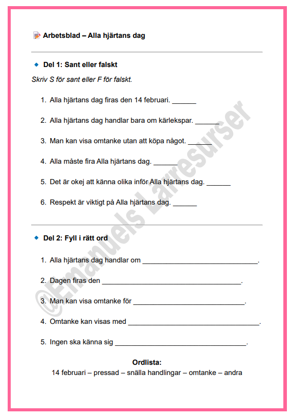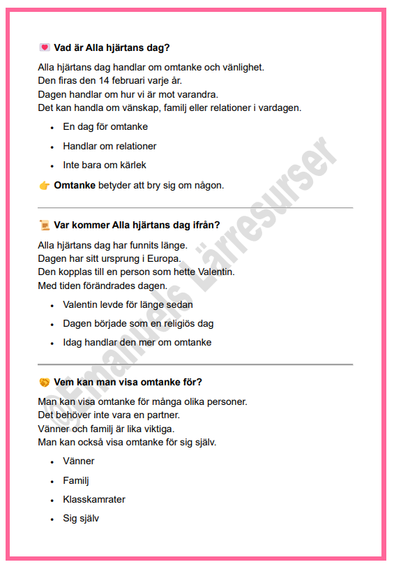 Ett tydligt och inkluderande arbetsmaterial som tar upp Alla hjärtans dag ur ett värdegrundsperspektiv. Fokus ligger på omtanke, respekt, relationer och att alla får känna och delta på sitt eget sätt. Materialet undviker romantisk press och passar alla elever.
