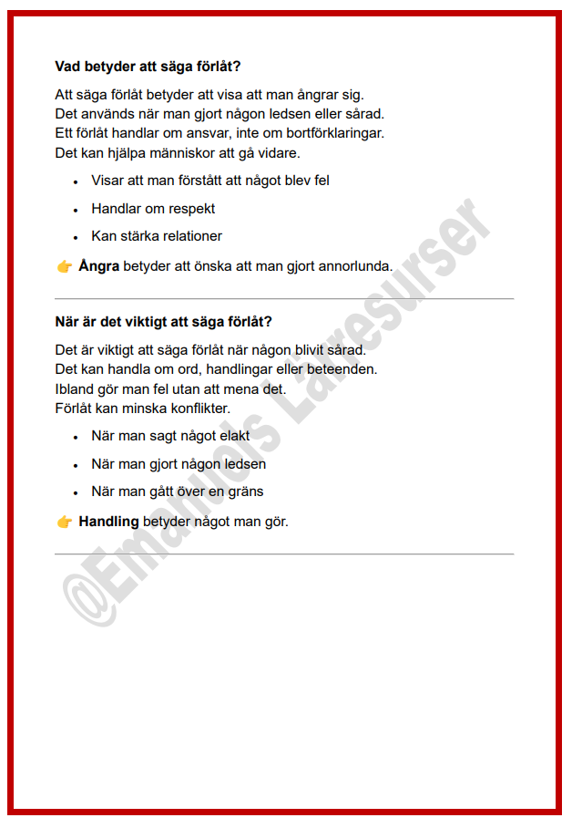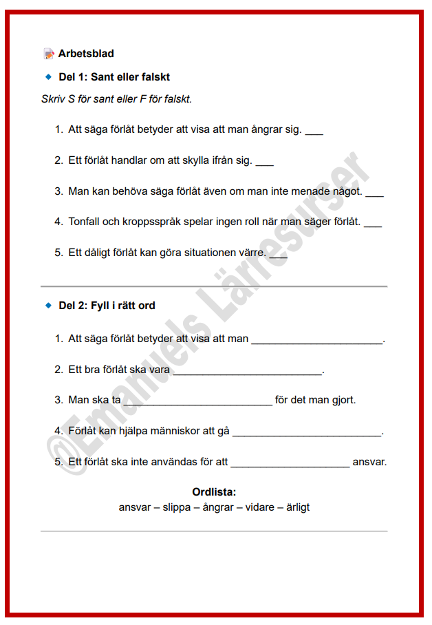 Ett tydligt och tryggt arbetsblad som hjälper elever att förstå vad det innebär att säga förlåt, när det är viktigt och hur man gör det på ett bra sätt.