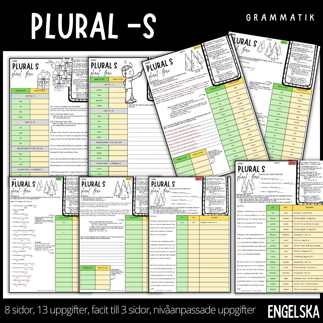 Låt eleverna öva på plural med hjälp dessa arbetsblad. Materialpaketet är 8 sidor och innehåller 13 olika uppgifter och 3 sidor facit. Vissa av uppgifterna är dessutom nivåanpassade i grön, gul och röd nivå. Gå igenom de grammatiska regler som finns kring plural med hjälp av stödstrukturen som finns på arbetsbladen, stöt och blöt kunskapen tillsammans och låt sedan eleverna jobba enskilt med arbetsbladen för att se om kunskapen befästs. Materialet är skapat för att stegvis bygga upp elevens självförtroende i engelsk grammatik, från grundläggande igenkänning till eget kreativt skrivande.