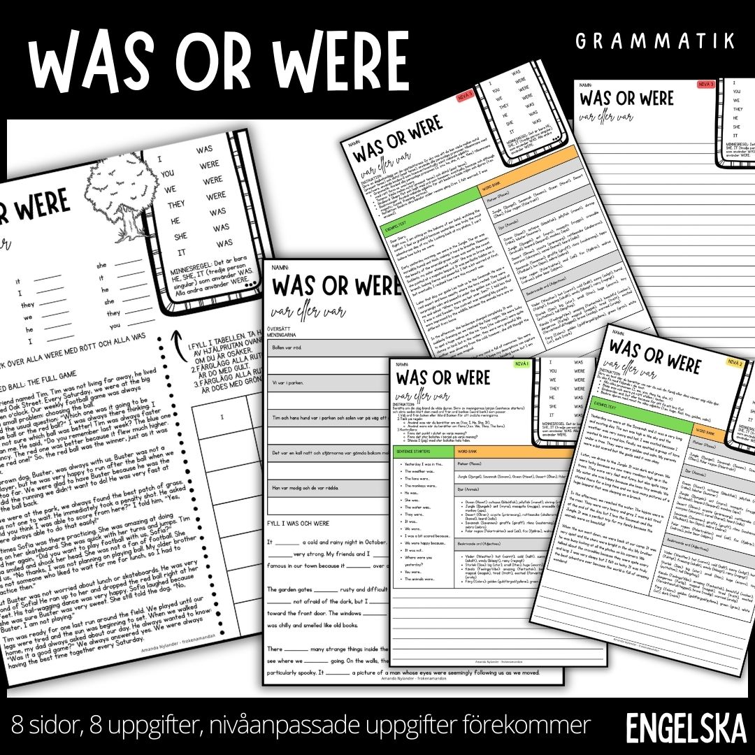 Låt eleverna öva på was or were med hjälp dessa arbetsblad. Materialpaketet är 8 sidor och innehåller 8 olika uppgifter. Vissa av uppgifterna är dessutom nivåanpassade i grön, gul och röd nivå. Gå igenom de grammatiska regler som finns kring was och were med hjälp av stödstrukturen som finns på arbetsbladen, stöt och blöt kunskapen tillsammans och låt sedan eleverna jobba enskilt med arbetsbladen för att se om kunskapen befästs. Materialet är skapat för att stegvis bygga upp elevens självförtroende i engelsk grammatik, från grundläggande igenkänning till eget kreativt skrivande.   Tydlig struktur och stöd: Varje sida innehåller en visuell stödstruktur/minnesregel som påminner eleven om att was används vid tredje person singular (he, she, it) samt I, medan were används för övriga. Varierade uppgifter: Paketet innehåller 8 olika delar, inklusive: Läsförståelse: Markera was och were i en berättande text. Översättning: Från svenska till engelska för att befästa begreppen. Lucktexter: Fyll i rätt form i en spännande spökhistoria. Kreativt skrivande: Utforska savannen, djungeln eller polartrakterna med hjälp av tematiska ordlistor .   Nivåanpassat för alla (Grön, Gul, Röd): För att inkludera alla elever i klassrummet är uppgifterna uppdelade i tre tydliga nivåer: Nivå 1 (Grön): Fokus på meningsbyggnad med färdiga "sentence starters" och en omfattande ordlista. Nivå 2 (Gul): Här får eleverna skriva friare texter om vilda djur och öva på att använda bindeord som and, but och because. Nivå 3 (Röd): Utmanar de starkare eleverna att skriva dagboksinlägg där de växlar mellan nutid och dåtid samt använder mer avancerade bindeord som however och eventually.