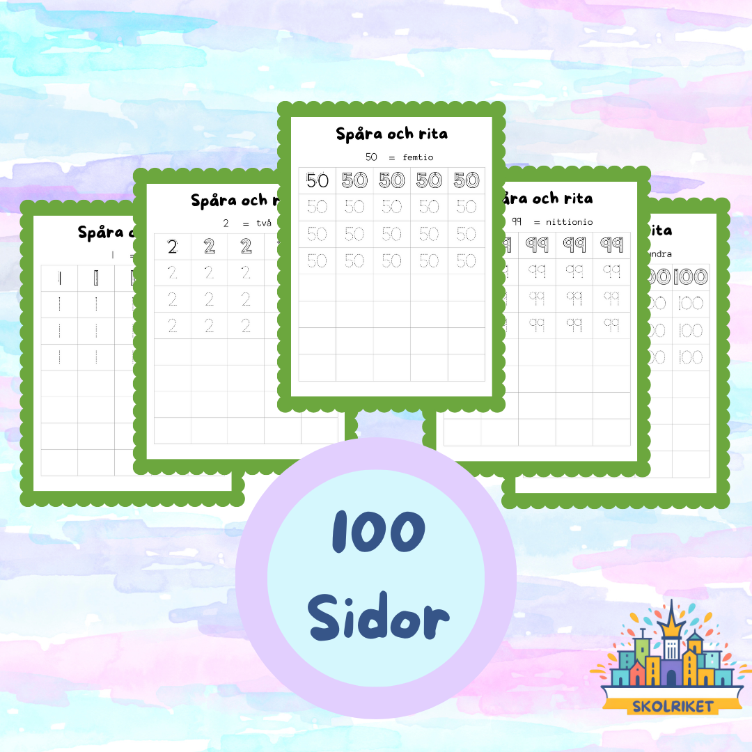 En arbetsbok med fokus att spåra och skriva nummer 1 till 100. Produkten innehåller 100 sidor. Kan skrivas ut och lamineras för att använda om och om igen.