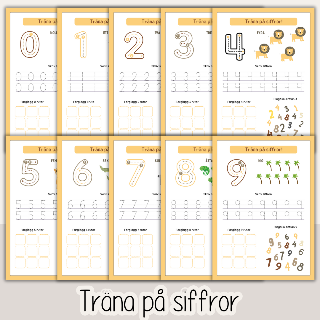 Träna på att läsa, skriva, räkna, färger former.