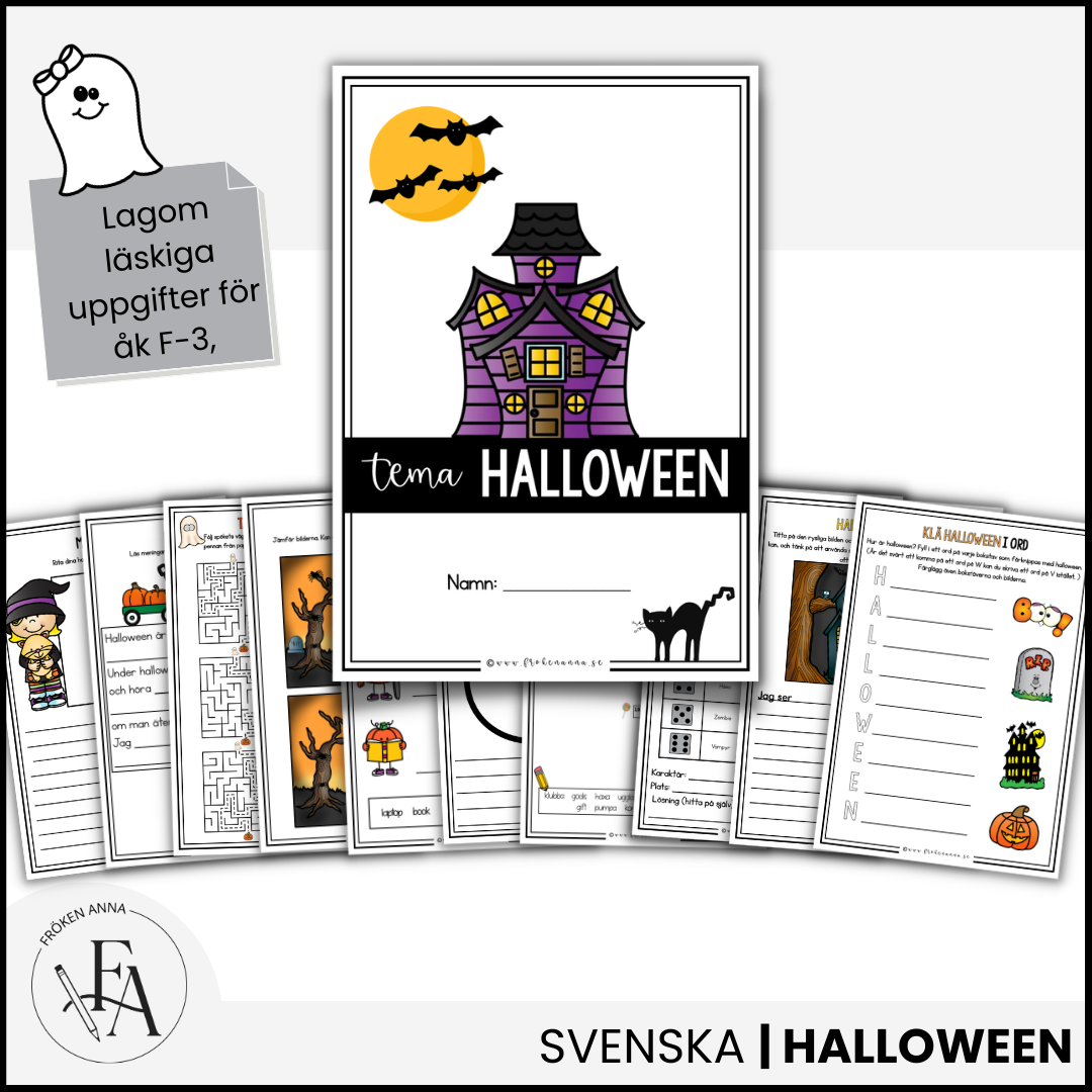 Arbetshäfte på 14 sidor (inkl. framsida) med blandade uppgifter som passar att göra i samband halloween. Häftet innehåller skriv- och rituppgifter blandat med korsord och kluringar bland annat. Välj de sidor som passar just din elev- eller barngrupp. Ha så skoj!