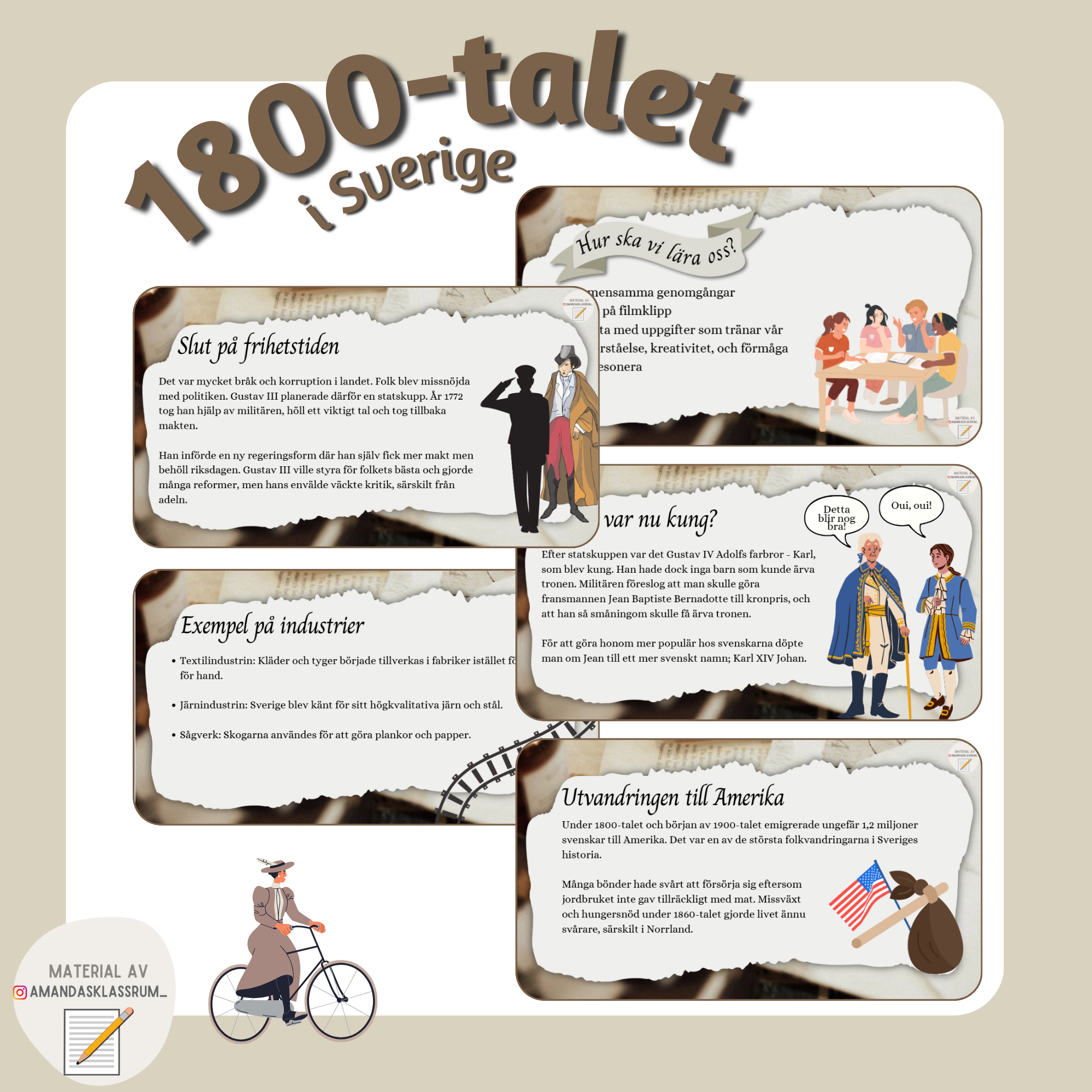 Ett arbetsområde om 1800-talet i Sverige. Materialet sträcker sig över hela 14 lektioner och behandlar följande områden: