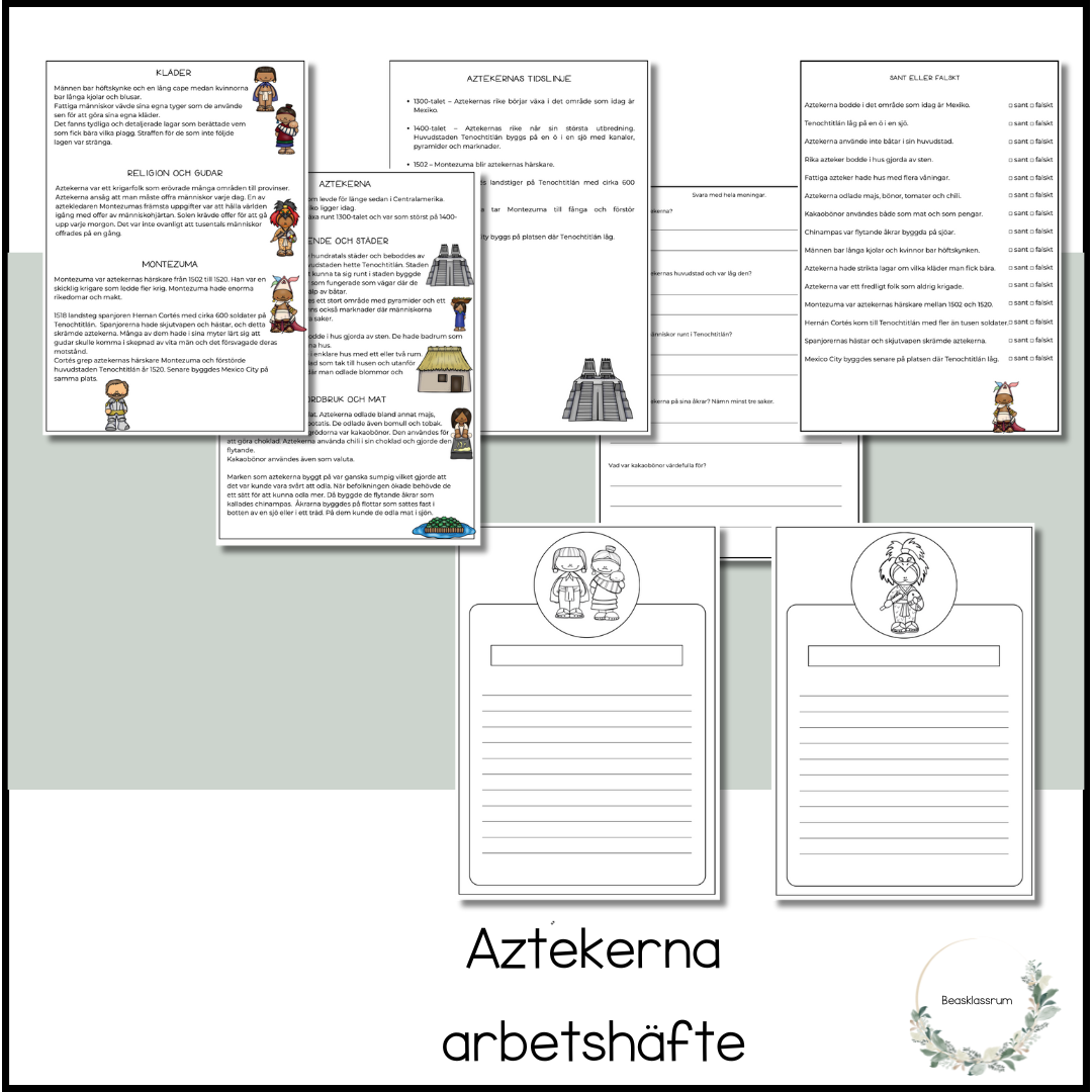 Aztekerna - arbetshäfte 2 sidor med fakta om aztekerna -boende och städer -jordbruk och mat -kläder -religion och gudar -Montezuma 2 sidor med läsförstelsefrågor 1 sida Sant eller falskt Aztekernas tidslinje 8 skrivsidor där eleverna kan skriva egen fakta