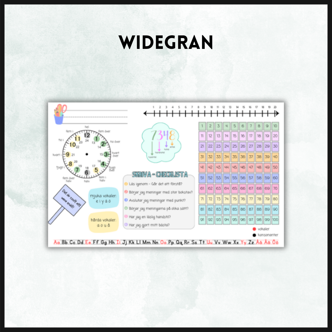 Innehåller: plats för namn, klockan, hårda och mjuka vokaler, alfabetet, talsorter, tallinje 0-20, hundrarutan samt checklista för skrivuppgifter.