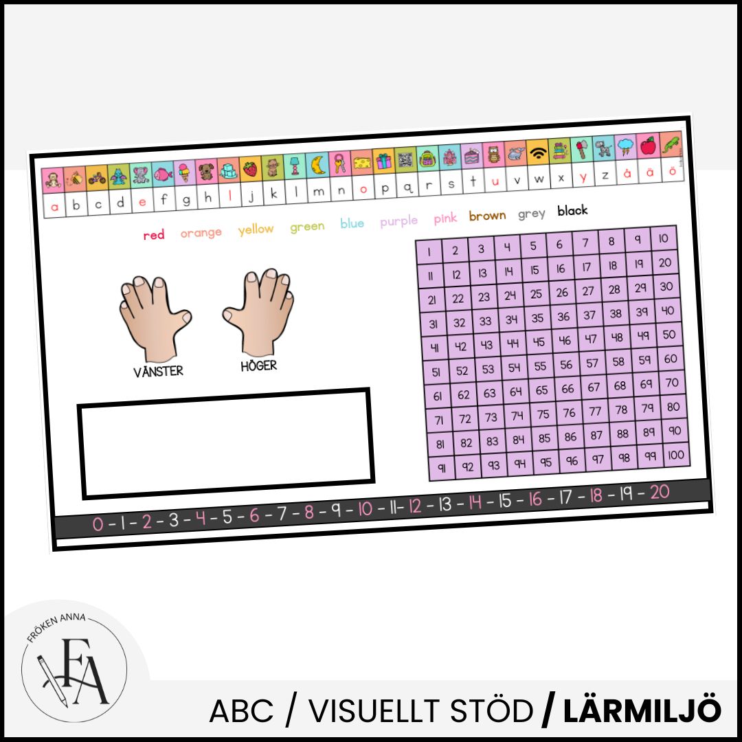 Bänkhjälp för elever som behöver visuellt stöd när de lär sig alfabetet, bokstäverna, siffrorna, färgnamn samt höger och vänster. Perfekt för bänkar eller bord.