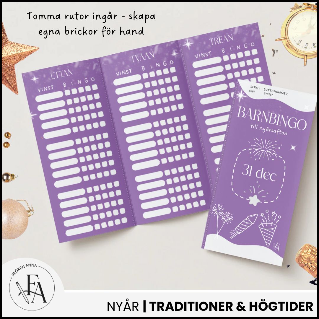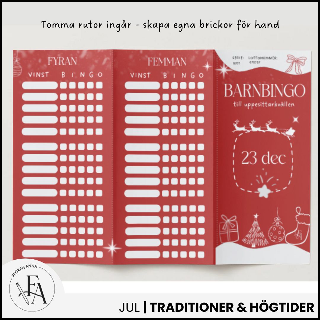 Gör både uppesittarkvällen och nyårsafton extra roliga för barnen med detta färdiga bingopaket för jul och nyår.Här får du två barnanpassade bingolotter som skapar gemenskap, skratt och förväntan – helt utan stress eller prestation. ☑️ Detta ingår i paketet: Barnens bingolott – uppesittarkvällen (23 dec) Barnens bingolott – nyårsafton (31 dec) Färdiga lotter - barnvänliga vinster Tomma rutor – skapa egna bingobrickor
