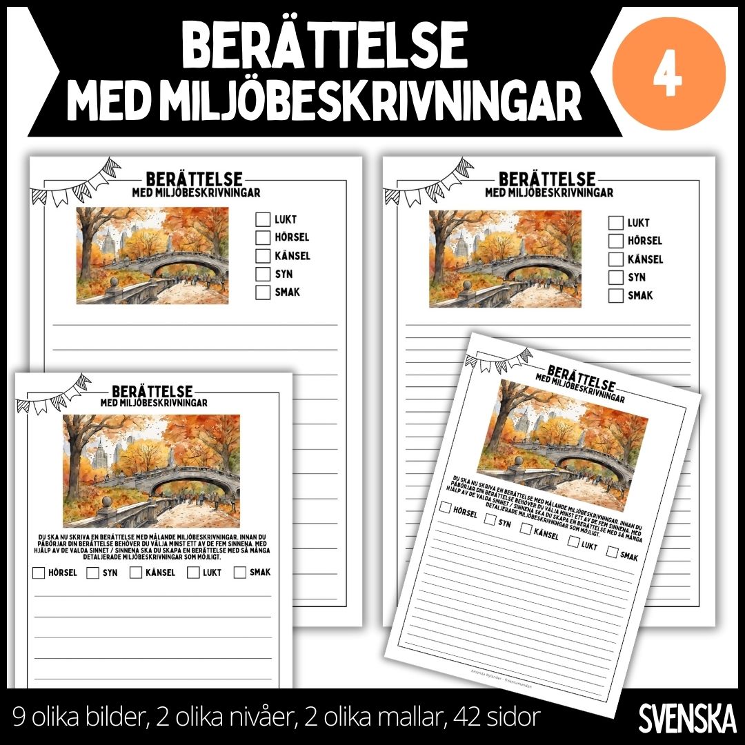 Låt eleverna öva på att skriva berättelser med målande miljöbeskrivningar med hjälp av dessa arbetsblad. Materialet består av totalt 42 sidor. Arbetsbladen är nivåanpassade, vilket innebär att det finns en mall där eleven förväntas skriva mer respektive en mall där eleven förväntas skriva mindre. Arbetsbladen är inte bara nivåanpassade, de har även två olika layouter vilket gör att arbetsbladen går att använda var och en för sig eller tillsammans som en fram- och baksida. Om man inte vill använda mallarna tillsammans som en fram- och baksida tillkommer även två sidor (en mall med fler rader samt en mall med färre rader) som endast består av rader som man kan använda som baksida till någon av de andra mallarna. Mixa och matcha som du vill. Materialet innehåller totalt nio olika illustrationer / bilder. Fyra stycken av arbetsbladen består av en tom ruta där eleverna själva får måla en bild som de sedan får konstruera en berättelse till. Varje arbetsblad innehåller en stödstruktur där eleverna får kryssa i vilket / vilka sinnen de vill använda sig av när de ska öva på att skriva sin berättelse med målande miljöbeskrivningar.