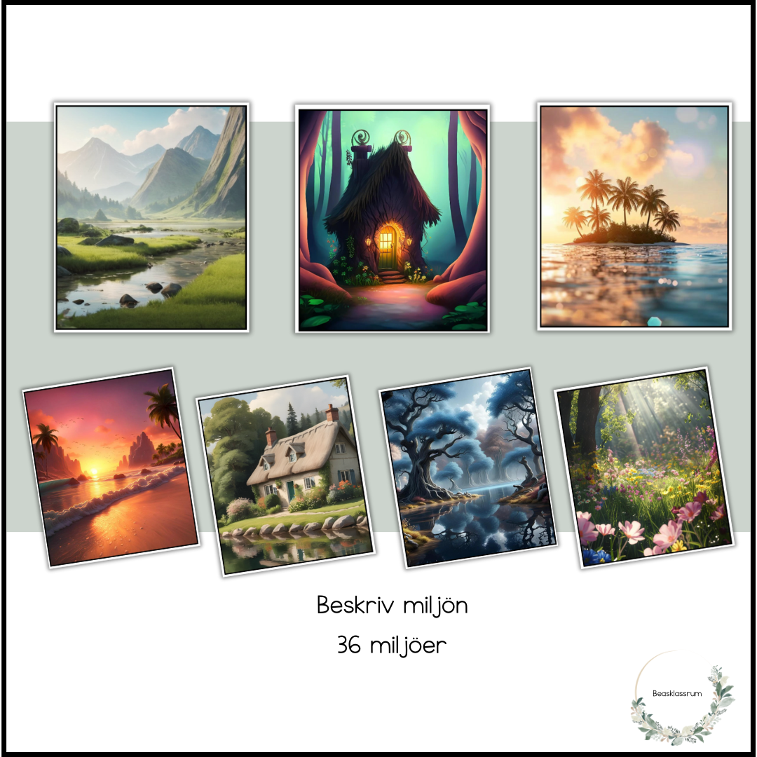 36 miljöbilder att använda när eleverna ska träna på att göra miljöbeskrivningar. Perfekt att använda även till engelskan.
