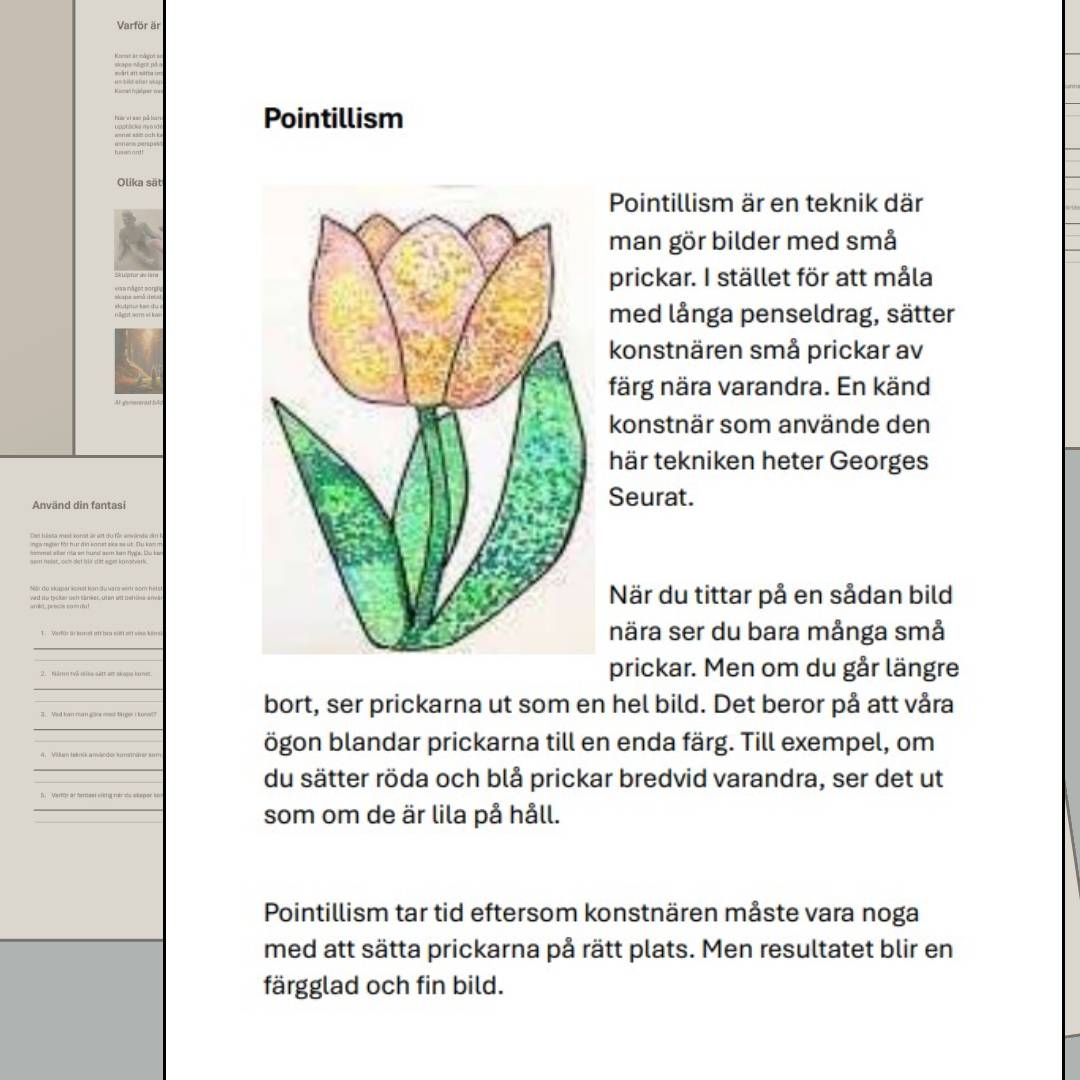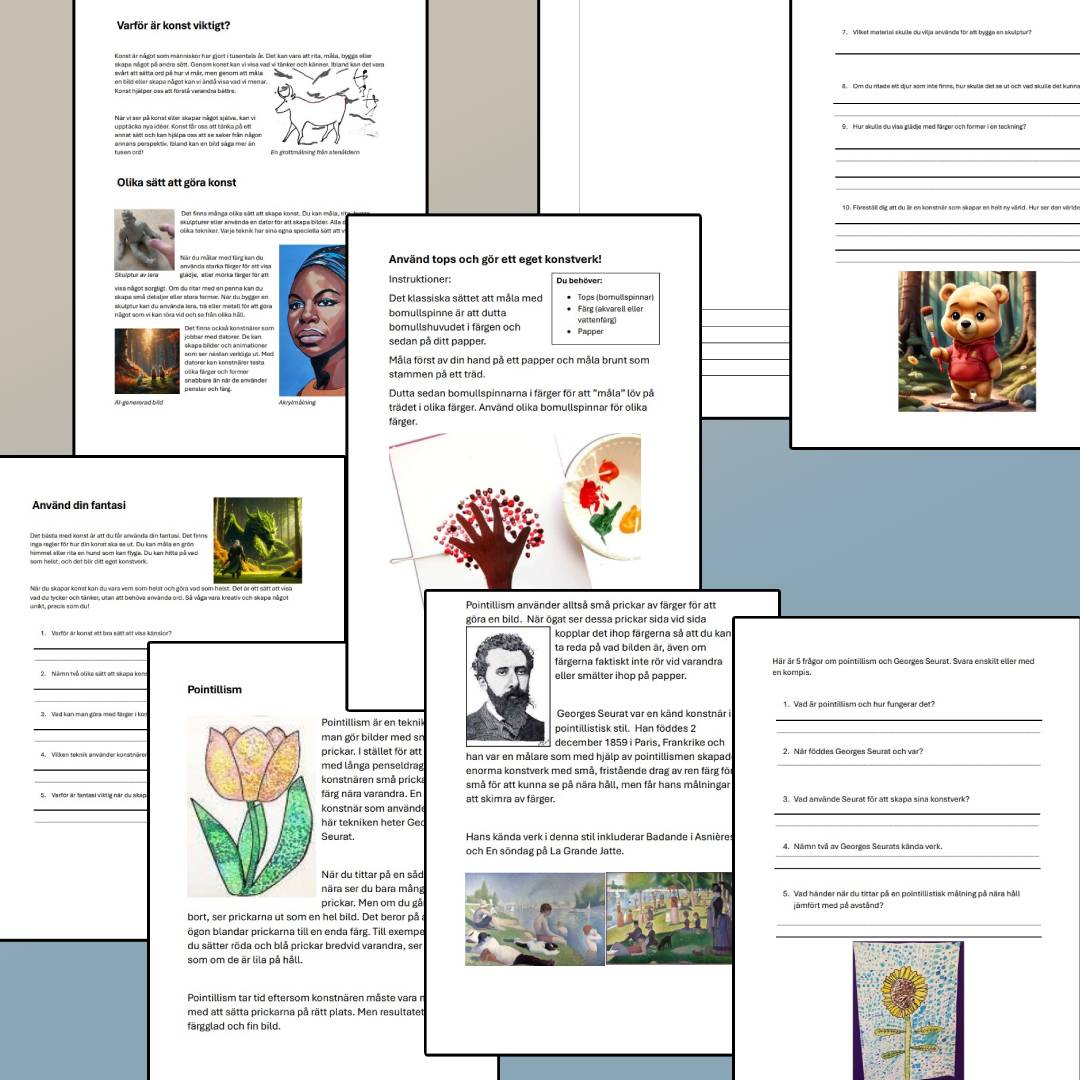 Här kommer ett häfte på 8 sidor med fakta om konst med tillhörande frågor, arbetsuppgifter som tränar eleverna att använda sin fantasi, en bilduppgift i pointillism, fakta om pointillism och läsförståelsefrågor.