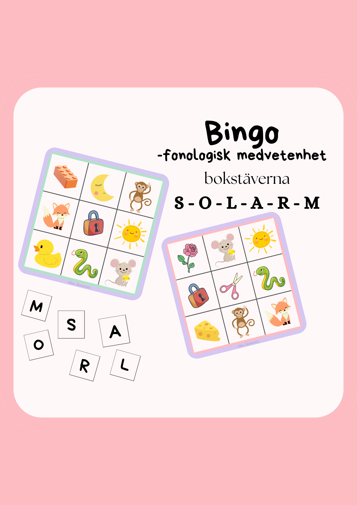 Träna på elevernas fonologiska medvetenhet till bokstäverna S O L A R M genom bingo och gör lärandet lekfullt!