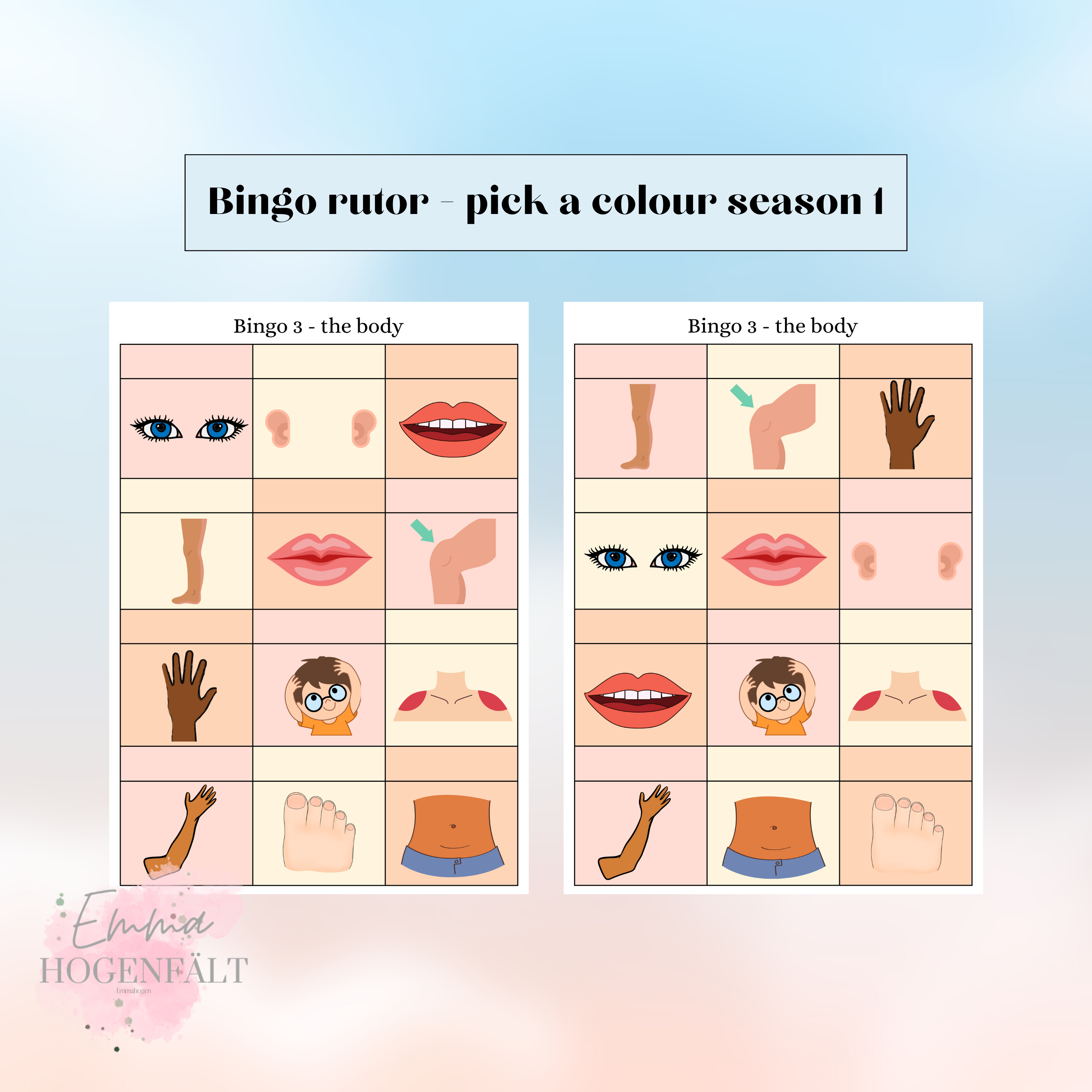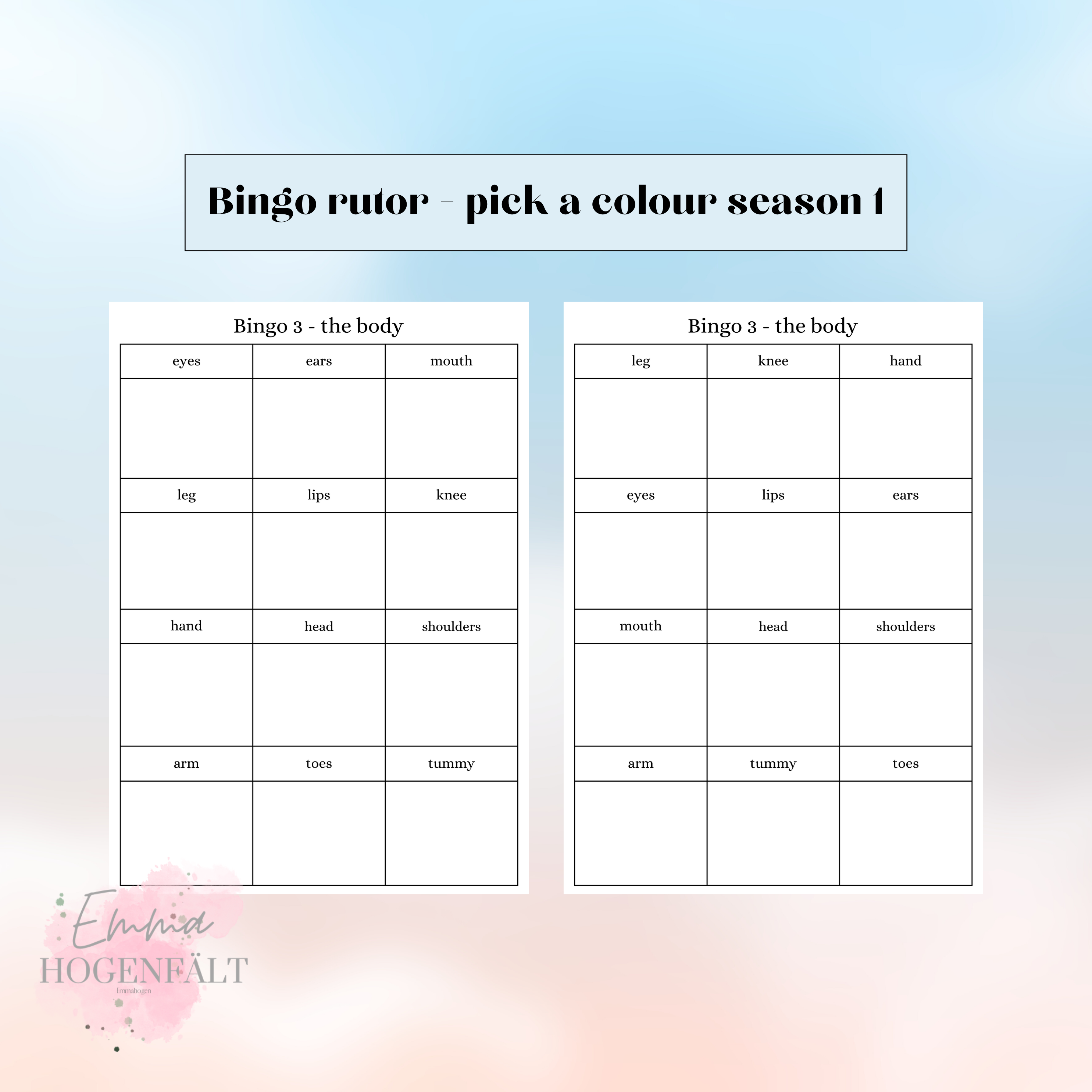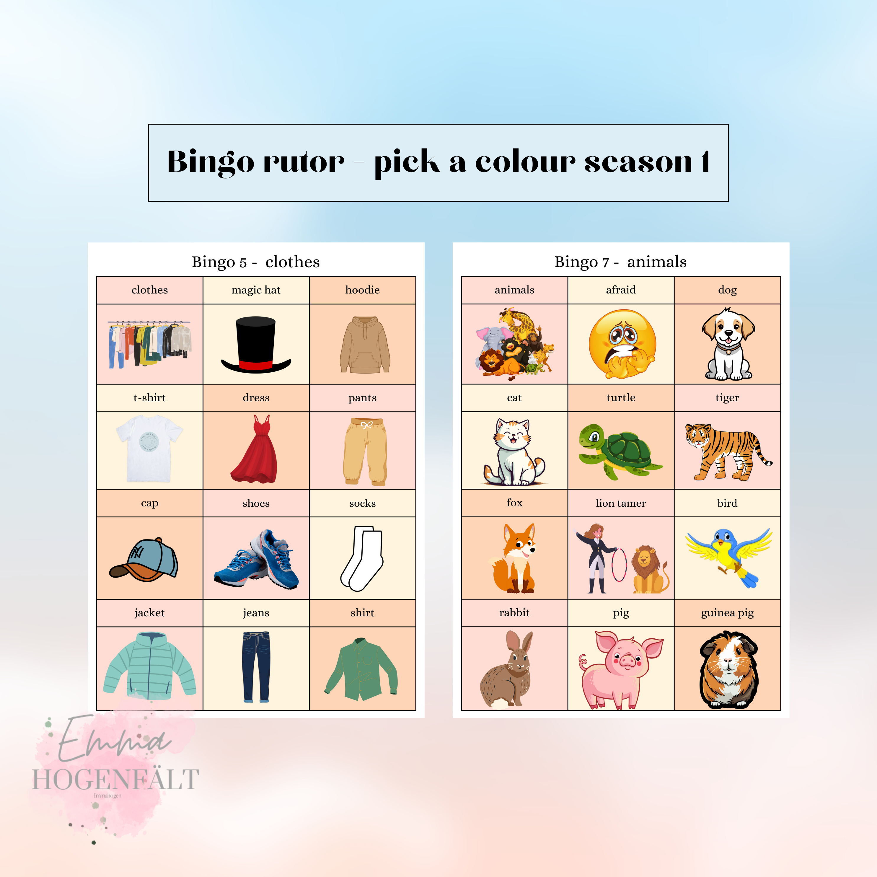 Bingorutor som innehåller olika ord som tas upp under program 1-10 av pick a color säsong 1. Jag använder dem i samband med att programmet visas i helklass. Eleverna ska under programmets gång kryssa för eller fylla i det ordet som står på deras ”bingoplan”. Eleverna kan måste därför vara aktiva och lyssna efter specifika ord under programmets gång. Efter att programmet är slut så samlar jag in papperna för att se vilka elever som har kryssat vad och vilka ord som gruppen eventuellt upplevde som svåra att höra.