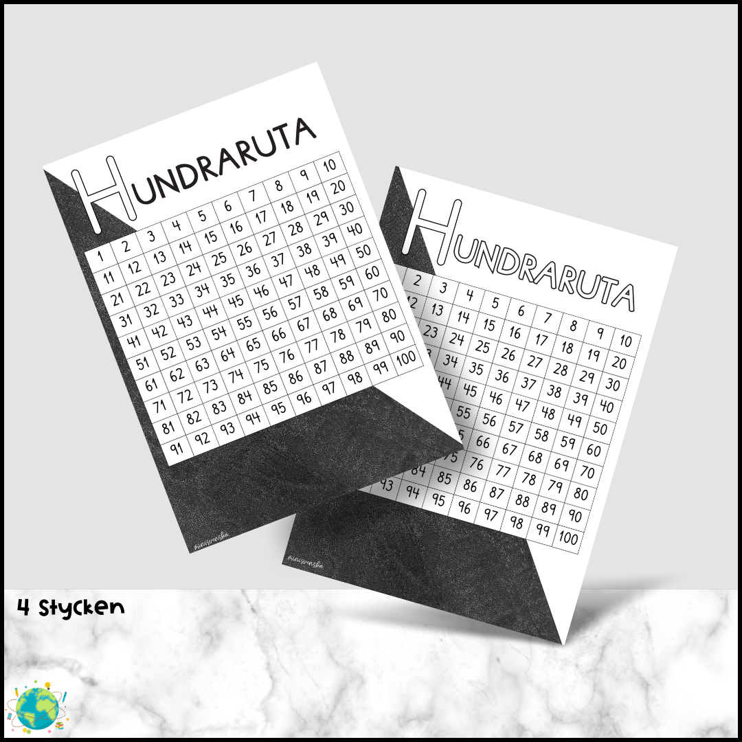 Matte-posters för visuellt stöd i klassrummet med temat: Black and white A4 PDF 4 olika hundrarutor multiplikationsruta