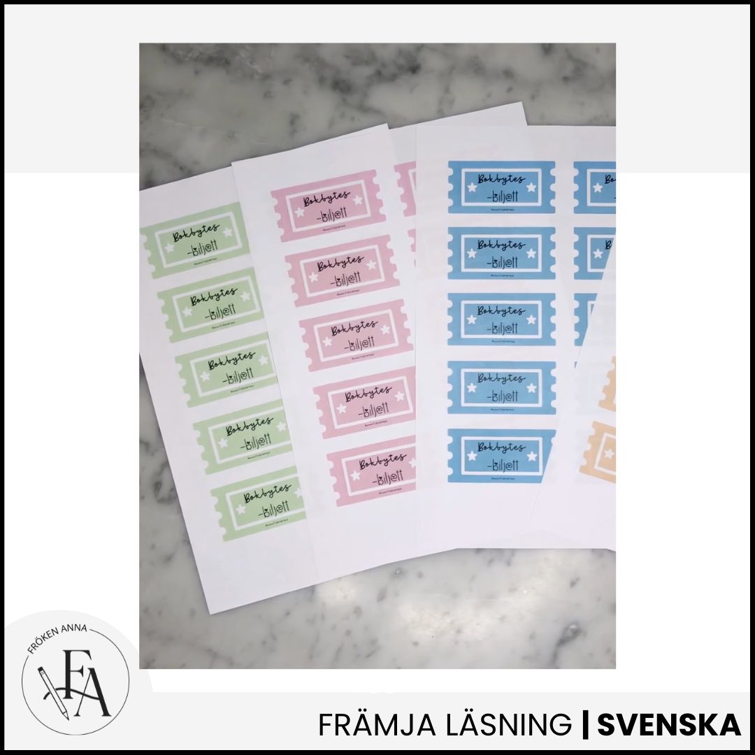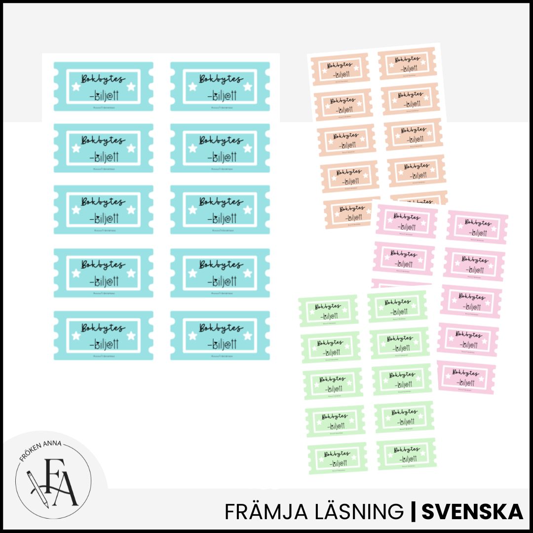 Bokbytesbiljetter är ett enkelt och roligt material för att anordna bokbytardag – perfekt för att främja läslust och återbruk av böcker. Biljetterna finns i fyra olika färger och kan användas flexibelt, till exempel som en biljett per bok eller där färgerna motsvarar olika antal böcker.