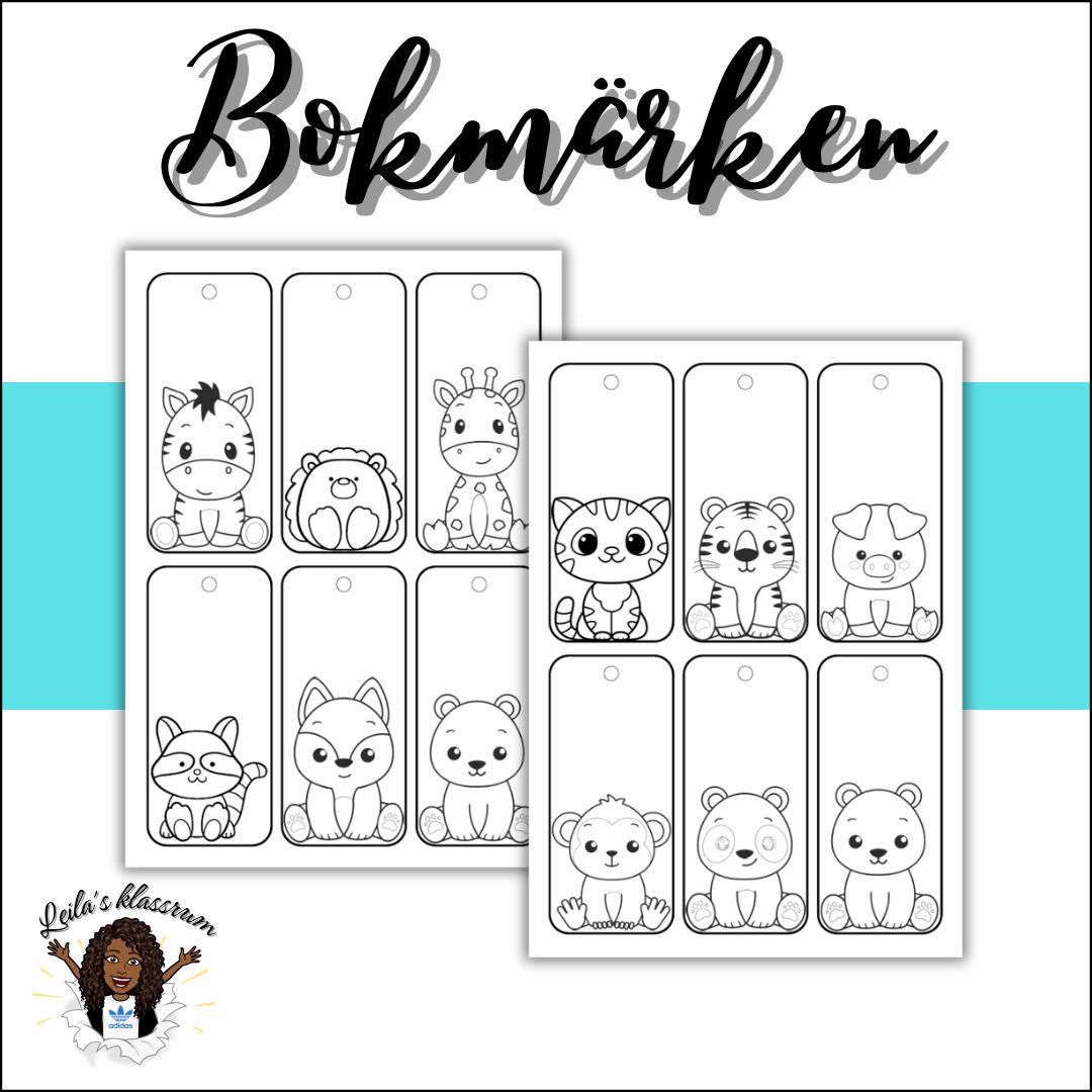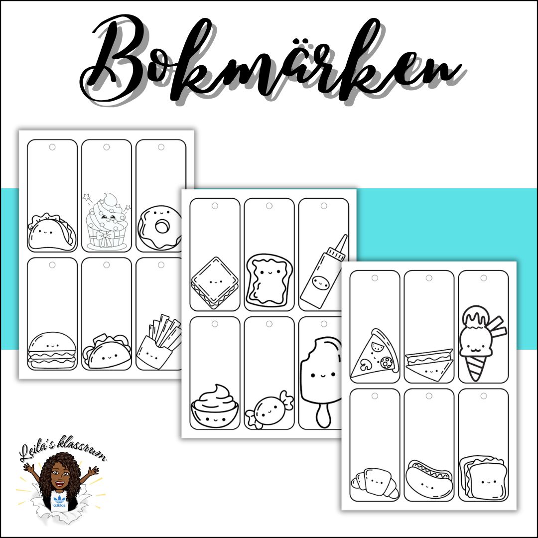 35 olika, dubbelsidiga bokmärken som eleverna kan färglägga. Motiven på dessa är djur och olika figurer av ätbara motiv.