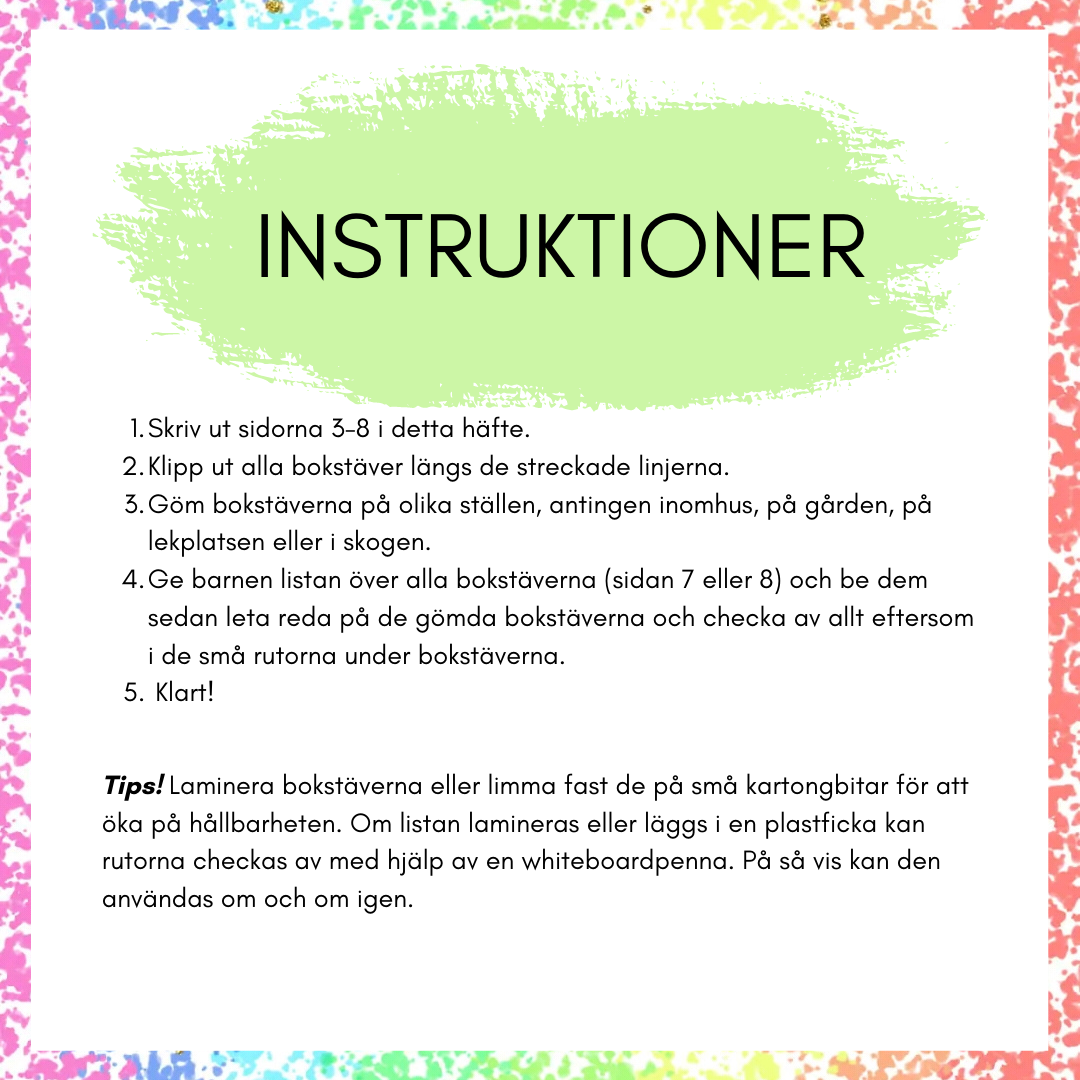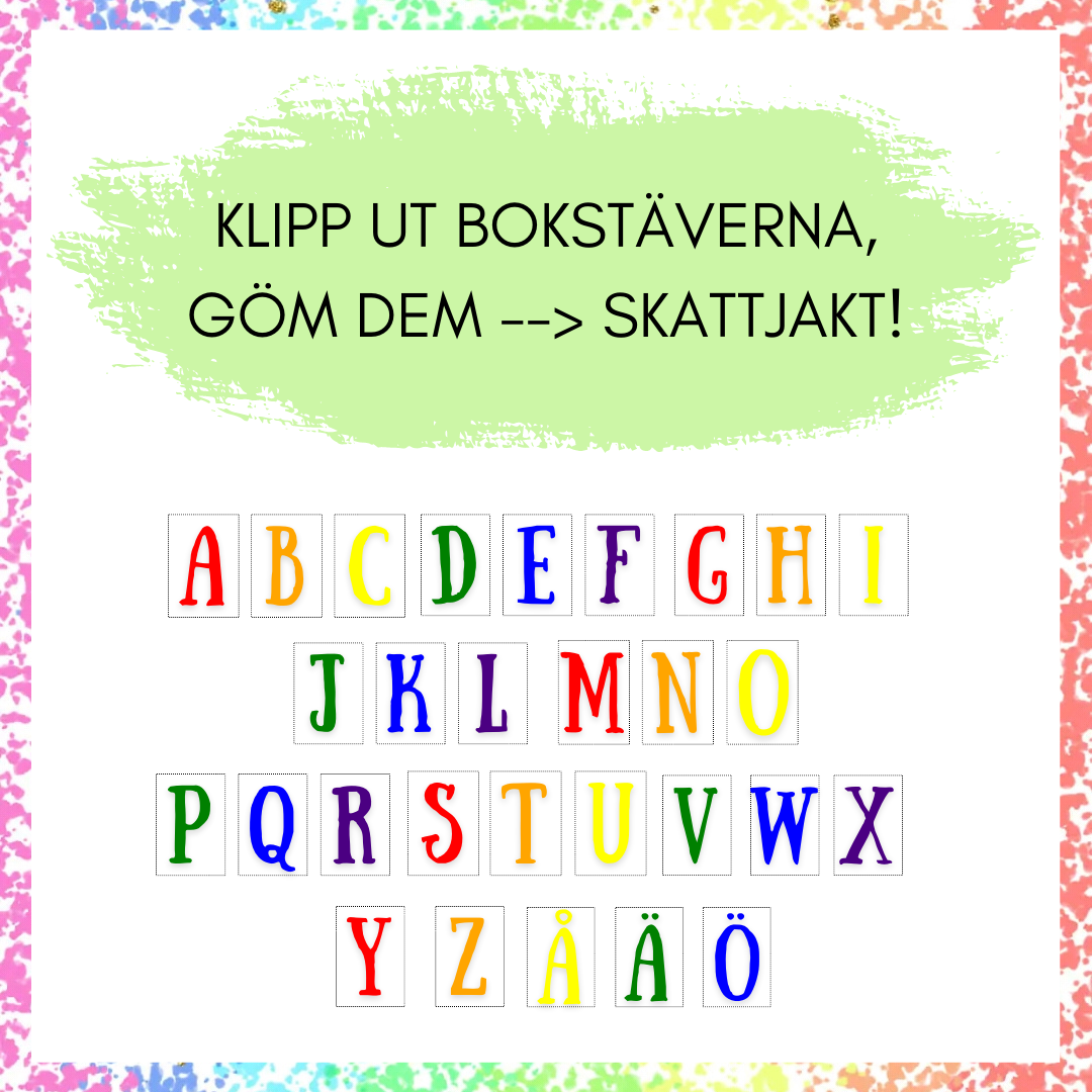Kan du hitta alla bokstäver? Lek och lär med hjälp av en rolig skattjakt som du enkelt fixar med hjälp av detta häfte. Öva på att känna igen bokstäverna eller på versaler och gemener.