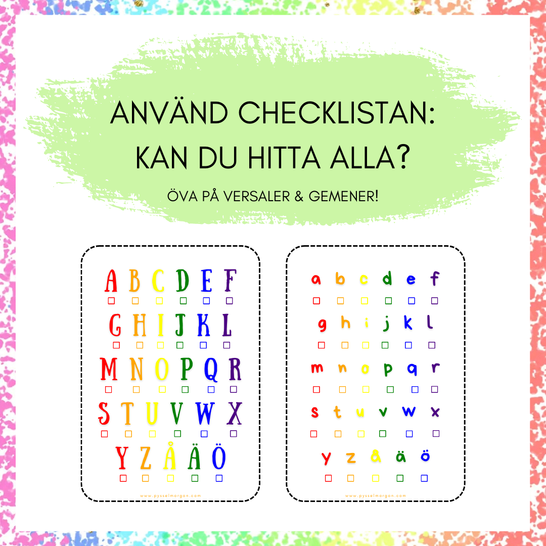 – Fyra checklistor med bokstäver (versaler och gemener) -i färg och svart och vitt