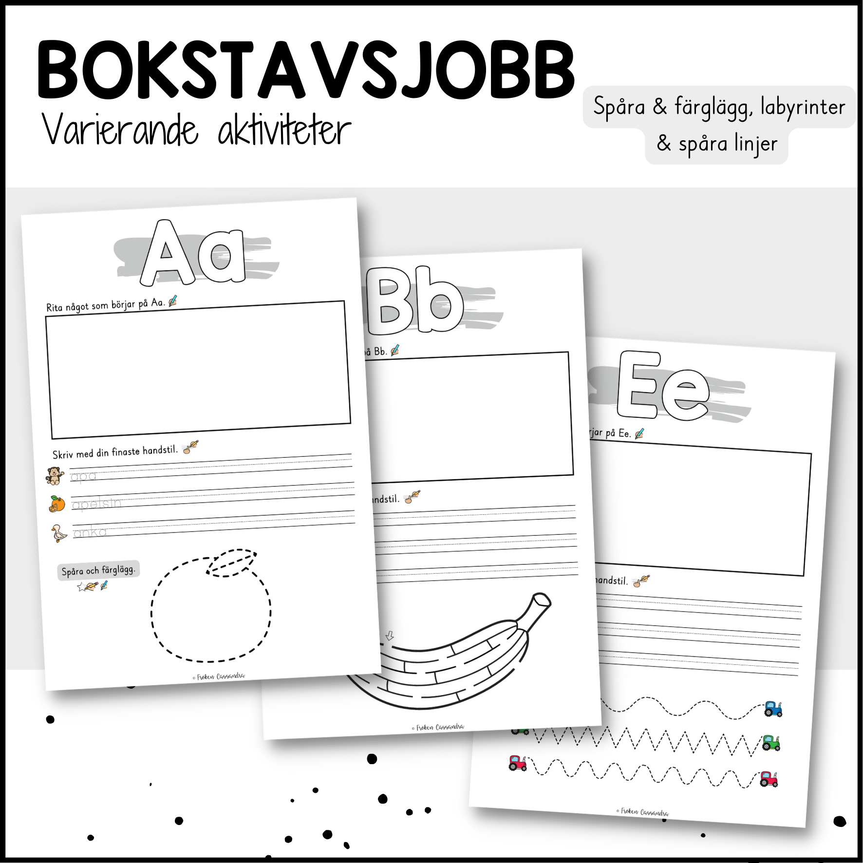 Ett gediget bokstavsjobb med 2 sidor per bokstav (totalt 58 arbetsblad) Här får eleverna träna på att: - Rita något på bokstaven - Leta och färglägg bokstaven - Spåra / skriva boksstaven - Skriva ord - Följa labyrinter - Spåra linjer - Spåra figurer
