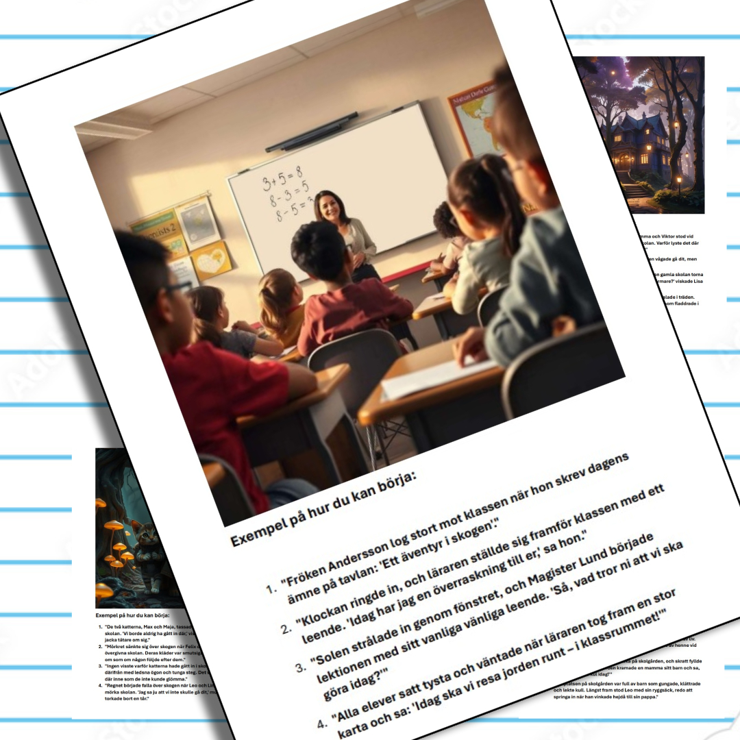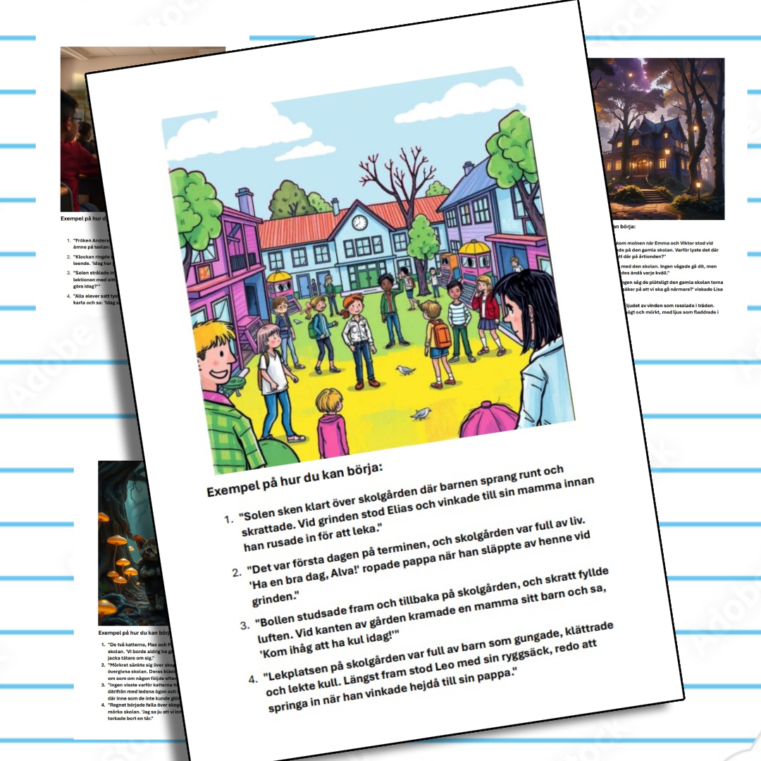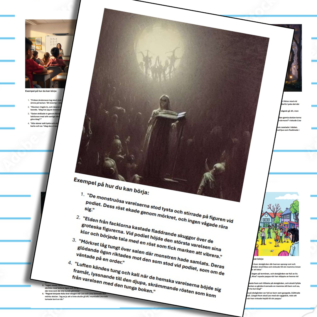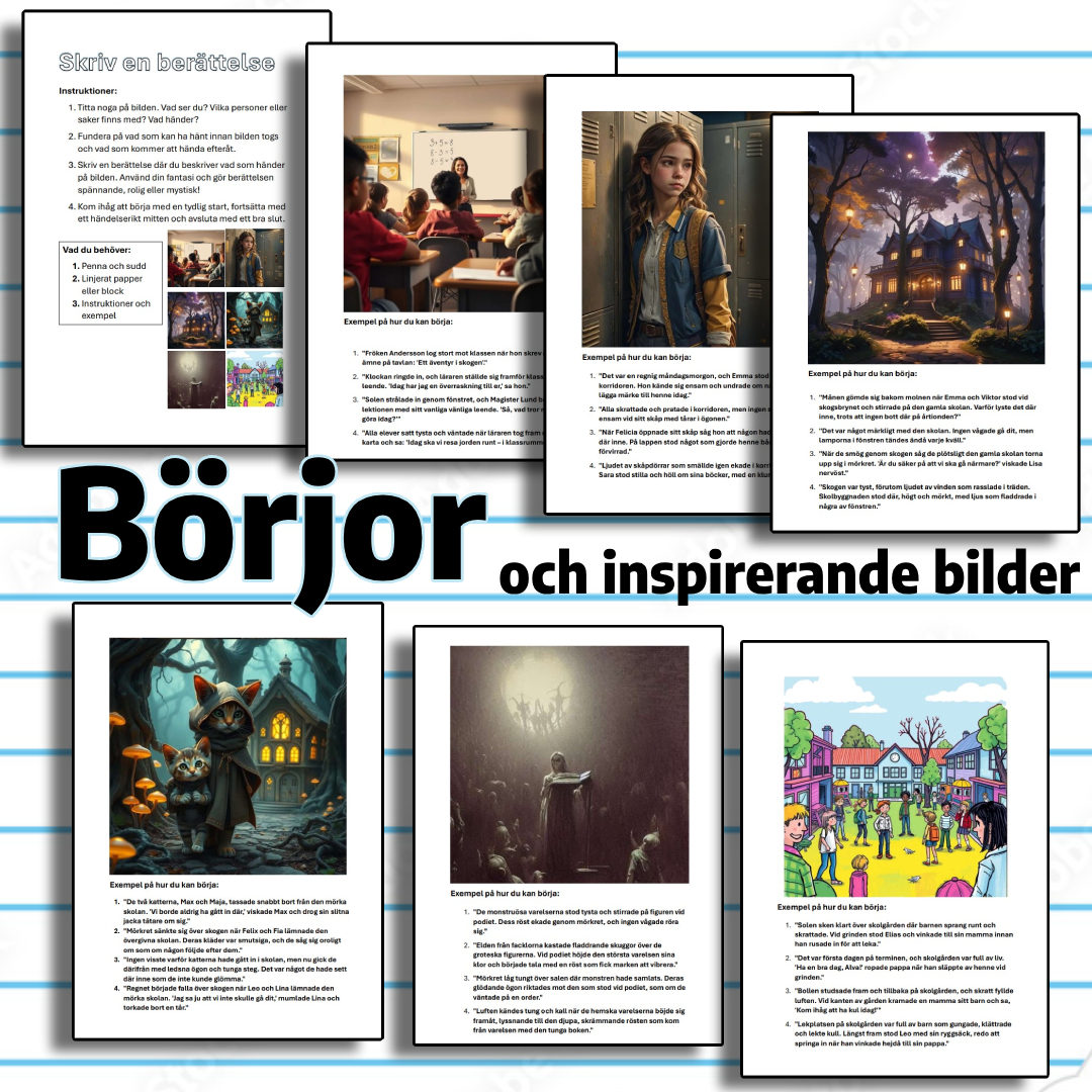 Det här materialet ger dig både färdiga ’börjor’ och inspirerande bilder som är perfekta för att kickstarta dina elevers skrivprocess. Låt dem upptäcka glädjen i att skapa sina egna berättelser – och gör det enkelt för dig att planera en uppskattad och effektiv skrivuppgift!