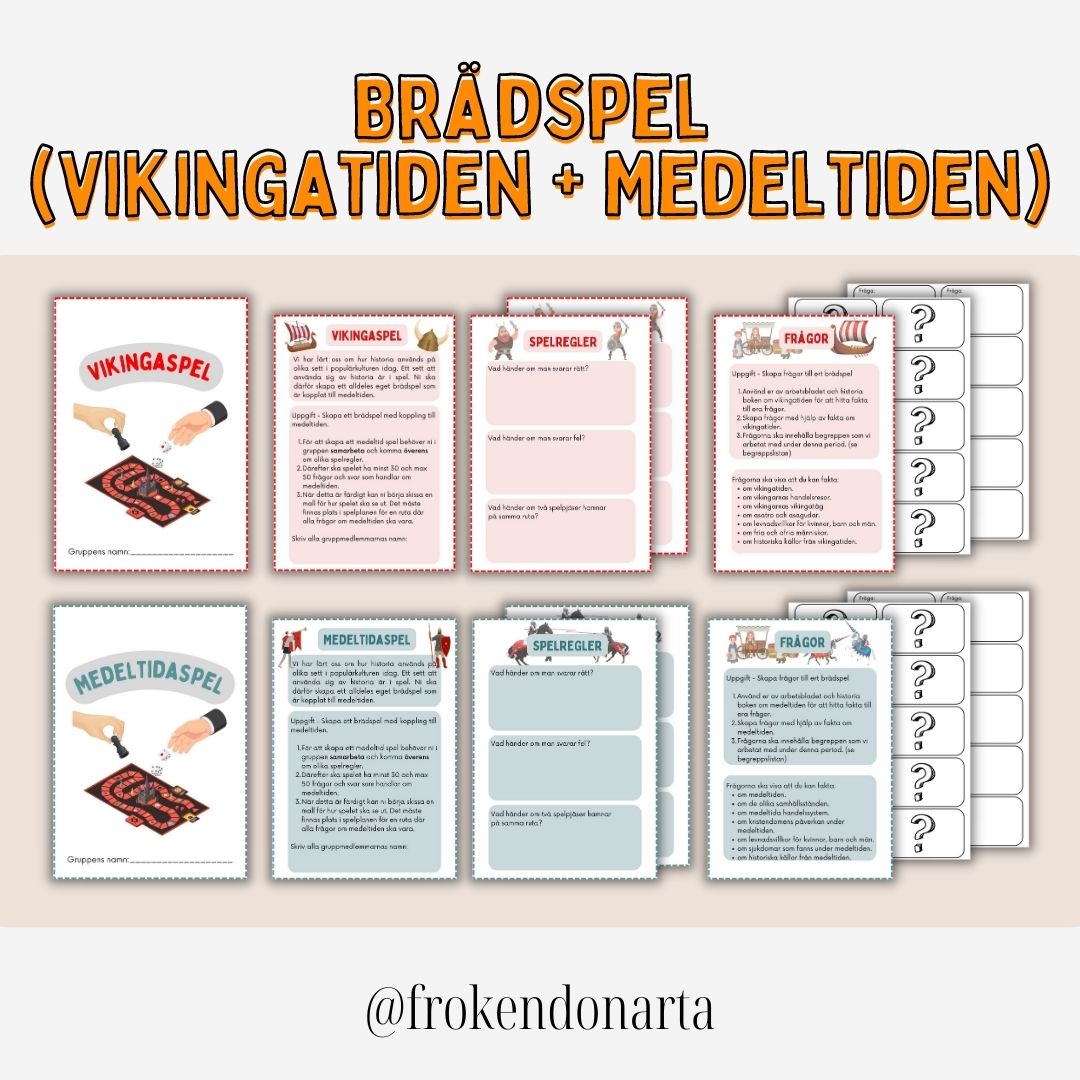 Detta material innehåller instruktioner på hur man gör för att skapa sitt eget brädspel, det ena materialet med temat vikingatiden och det andra med temat medeltiden. Materialet bör skrivas ut dubbelsidigt för då kommer frågekorten i slutet vara enkla att klippa ut och använda.