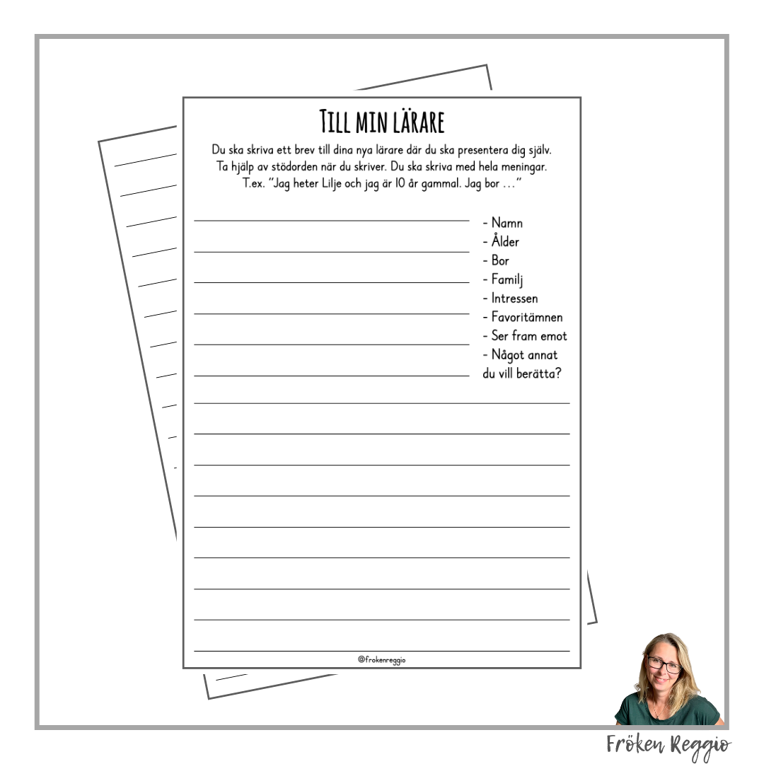 Mall med instruktioner för att skriva ett brev till sin lärare och berätta mer om sig själv.