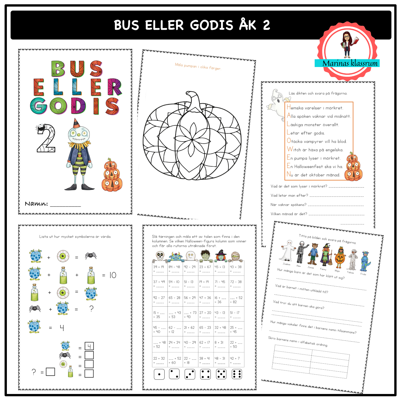 Ett Halloween-arbetshäfte på 11 sidor med blandade uppgifter i matte och svenska för åk 2. Sist i häftet finns en mandala-pumpa att måla och det är olika mönster i de olika arbetshäftena.