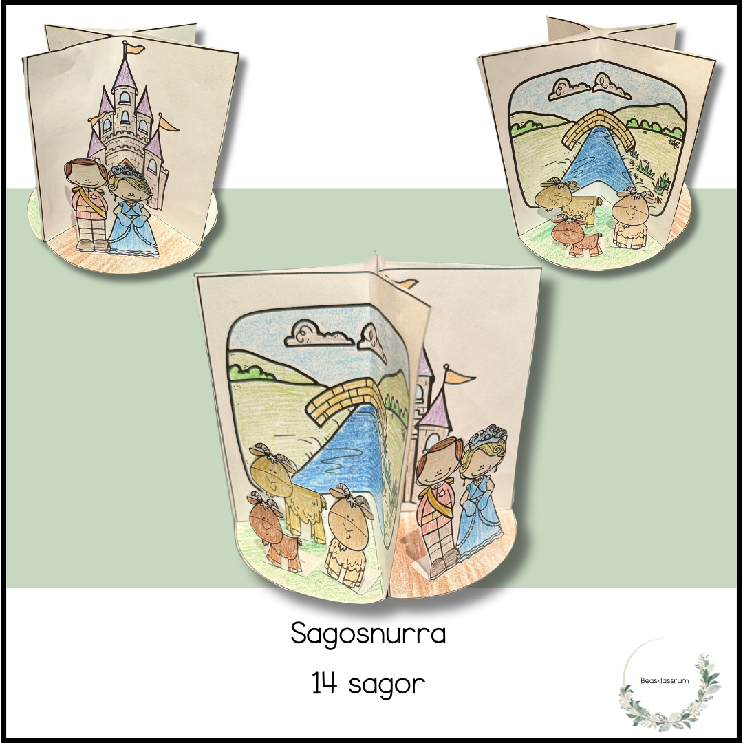 Skapa en sagosnurra med 4 olika sagor. Det finns 14 olika sagor att välja mellan. Låt eleverna färglägga, klippa ut, limma och bygga ihop sin egen snurra. Skapa nyfikenhet för läsning av sagorna. Återberätta sagorna med hjälp av snurran.
